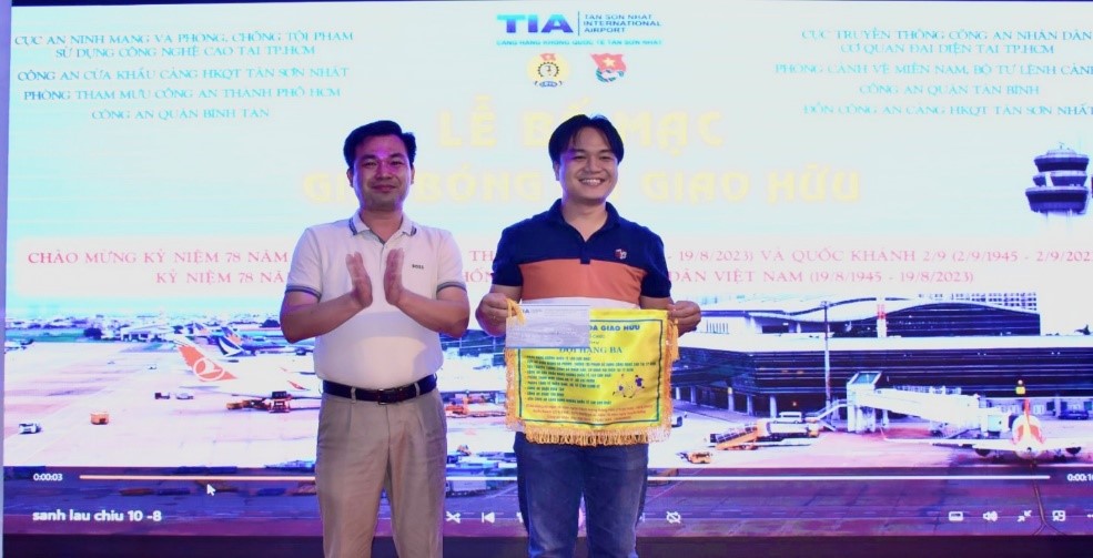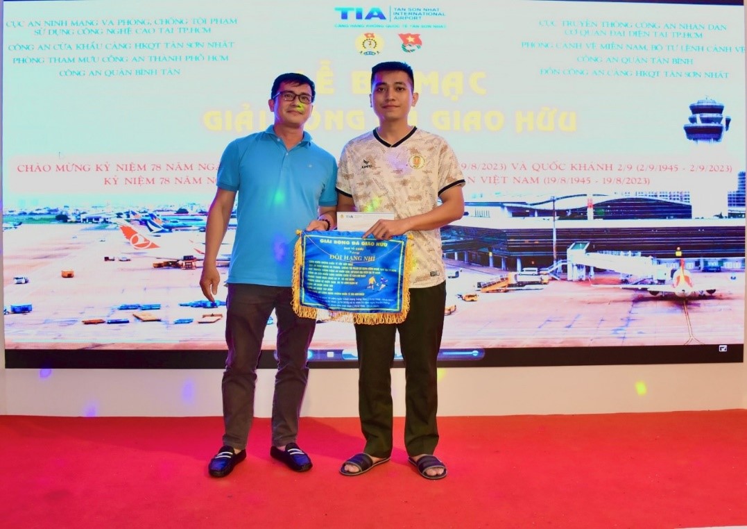 Trung tá Tạ Hoàng Thông, UV phụ trách Thanh niên, Phó trưởng Phòng 8, Cục An ninh mạng trao Giải II cho đại diện Đội bóng đá Công an Cửa khẩu Cảng HKQT Tân Sơn Nhất.