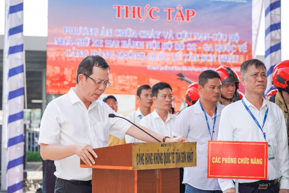 Trước khi diễn tập thực binh, đồng chí Nguyễn Công Hoàn UV. BTV Đảng ủy, Phó Giám đốc Cảng, Trưởng Ban Chỉ đạo diễn tập năm 2024 đã đặc biệt nhấn mạnh tầm quan trọng của công tác đảm bảo an toàn PCCC tại Cảng HKQT Tân Sơn Nhất. Qua đó, chỉ đạo các lực lượng tham gia diễn tập phải thực sự nghiêm túc, bám sát nội dung kịch bản, kế hoạch đã được phê duyệt; đảm bảo an toàn tuyệt đối về lực lượng, phương tiện trong quá trình diễn tập.