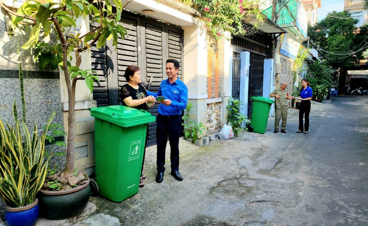 Đoàn viên, thanh niên phát tờ rơi tuyên truyền về “Bảo vệ môi trường khu dân cư và nơi công cộng” đến các hộ dân sinh sống gần khu vực lân cận.
