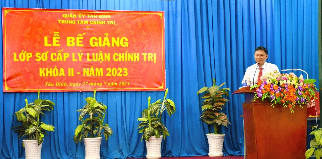Đồng chí Nguyễn Xuân Tiến, Trưởng Ban tuyên giáo Quận ủy, Giám đốc Trung tâm Chính trị quận Tân Bình phát biểu tại Lễ Bế giảng.