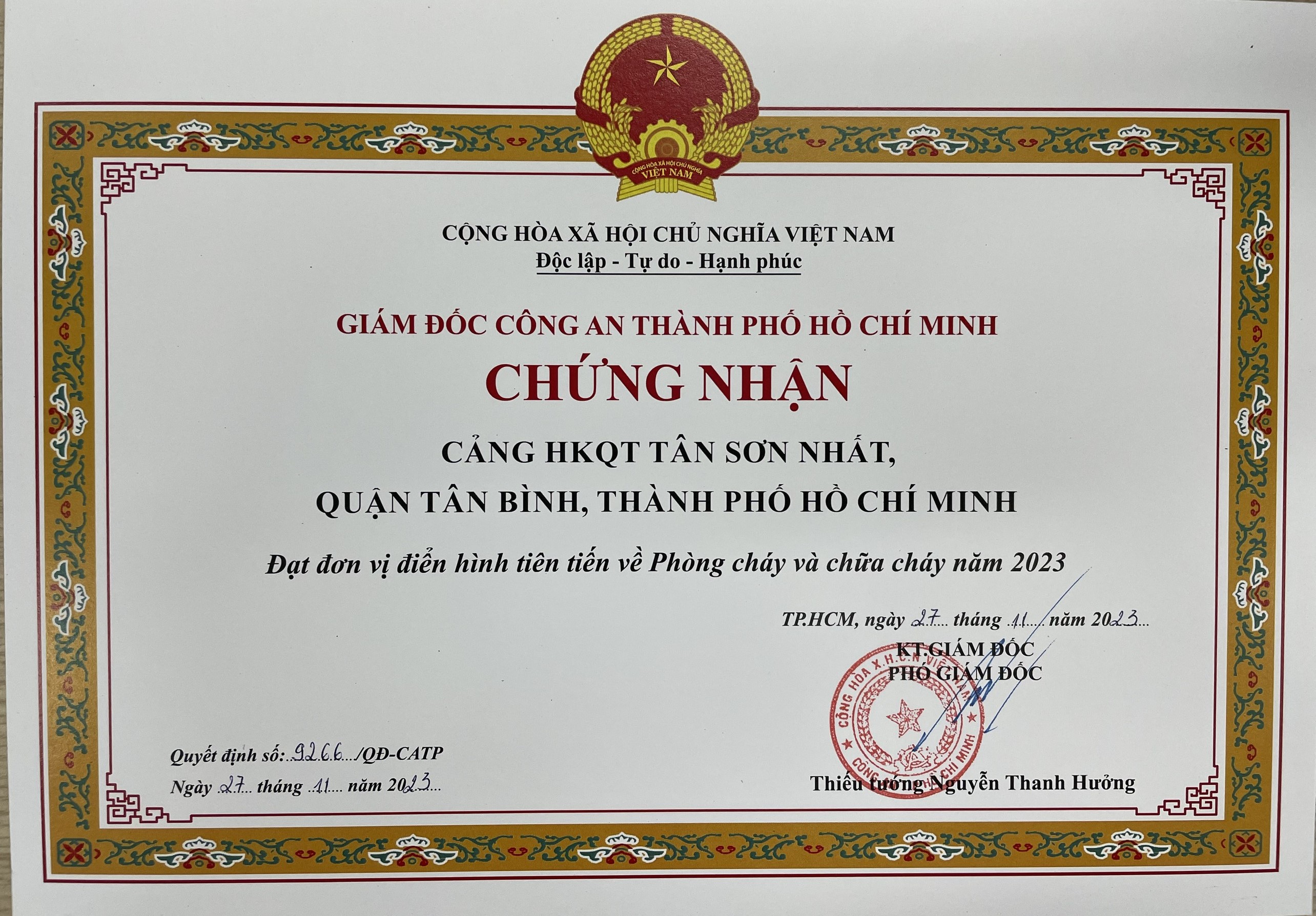 Phát huy kết quả và đạt được thành tích trong năm 2023, Chiều ngày 30/01/2024, đại diện Phòng Cảnh sát PCCC và CNCH – Công an Thành phố Hồ Chí Minh đã tổ chức trao tặng danh hiệu "Đơn vị điển hình tiên tiến về Phòng cháy và chữa cháy năm 2023" cho Cảng HKQT Tân Sơn Nhất theo Quyết định số 9266/QĐ-CATP ngày 27/11/2023 của Giám đốc Công an Thành phố Hồ Chí Minh.