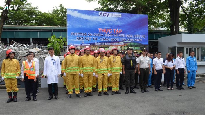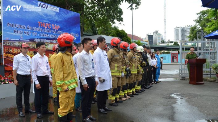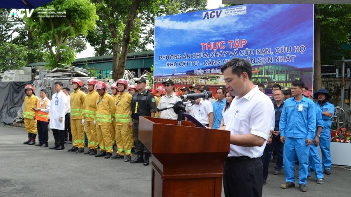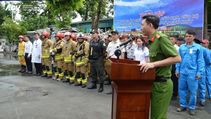 Diễn tập cấp cơ sở về PCCC&CNCH năm 2025 lấy tình huống giả định “Vào lúc 09h00p, xảy ra cháy tại kho vật tư Cảng HKQT Tân Sơn Nhất. Chất cháy chủ yếu là: phụ gia sơn, nhựa, cao su, vật tư trang thiết bị, diện tích đám cháy khoảng 40m2”. Đây là phương án do Giám đốc Cảng phê duyệt theo mẫu PC06 mới, tình huống cháy số 4 trong Kế hoạch đã được Cảnh sát PCCC&CNCH Công an Tp. Hồ Chí Minh phê duyệt ngày 13/8/2025.
