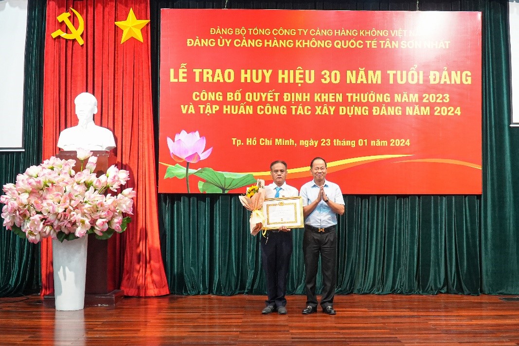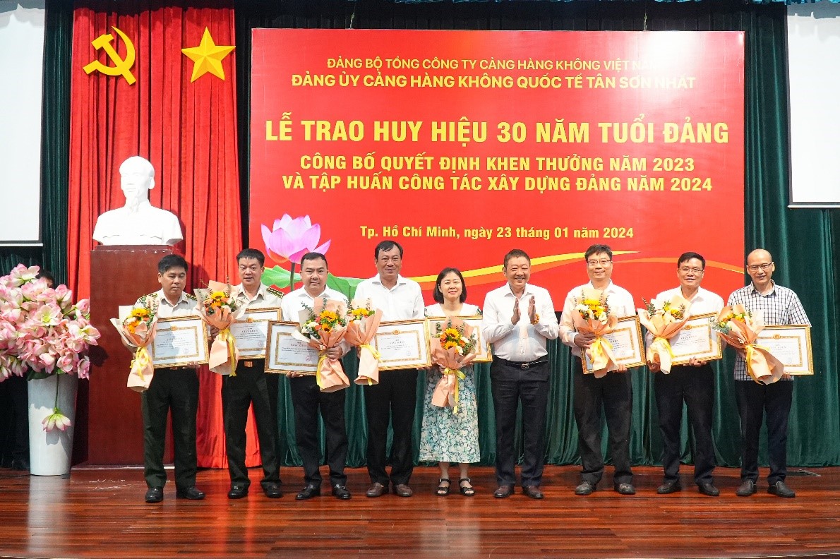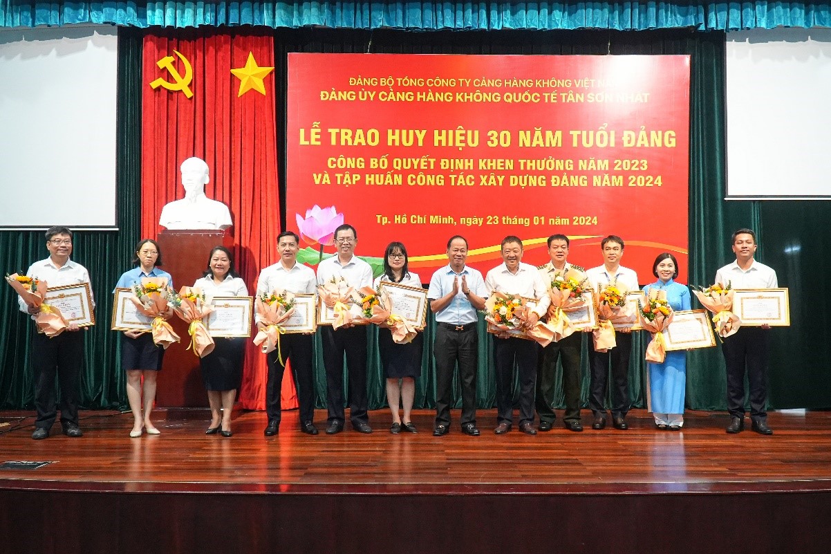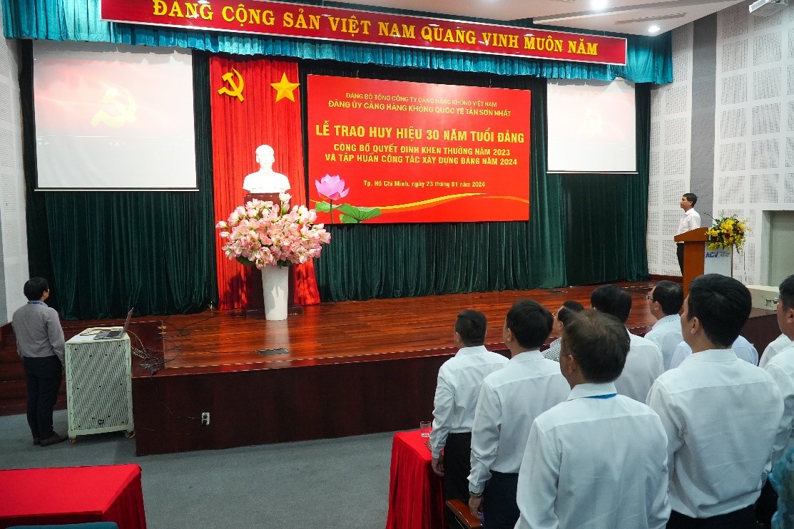 Sáng ngày 23/01/2024, Đảng ủy Cảng HKQT Tân Sơn Nhất đã tổ chức Hội nghị Trao huy hiệu 30 năm tuổi Đảng và tập huấn nghiệp vụ công tác xây dựng Đảng tại tòa nhà Tổng công ty Cảng hàng không Việt Nam – CTCP (ACV)