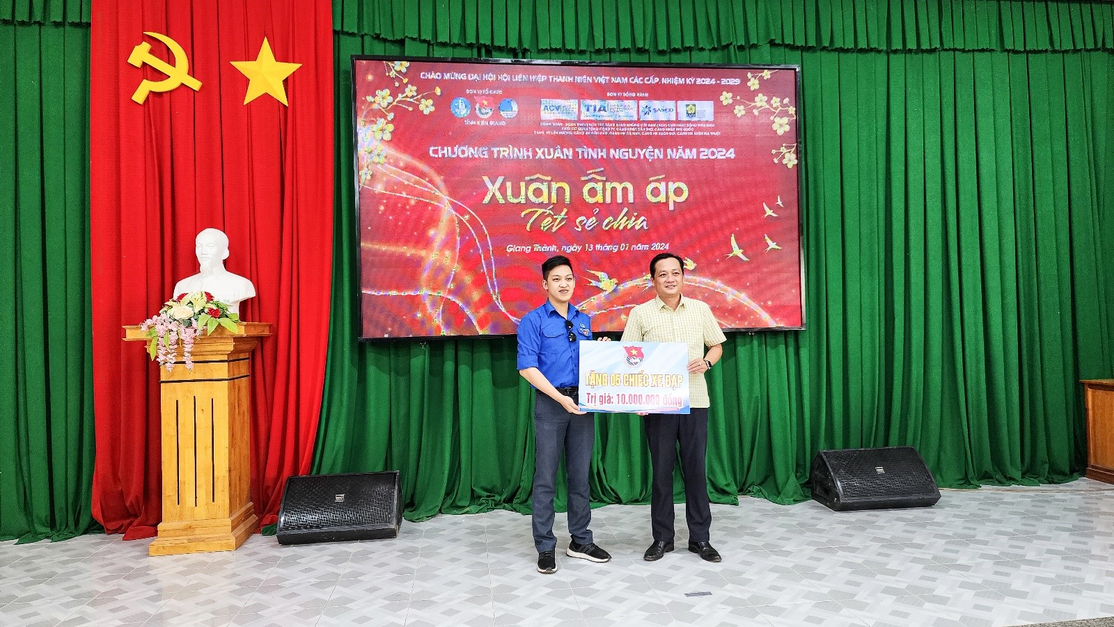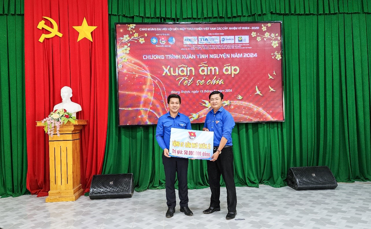 Đoàn tiếp tục di chuyển đến Phòng GD&ĐT huyện Giang Thành, tỉnh Kiên Giang. Tại đây, Đoàn đã phối hợp với chính quyền địa phương tổ chức chương trình “Xuân ấm áp – Tết sẻ chia” cho bà con nhân dân và trẻ em nghèo, hiếu học trên địa bàn. Đoàn tình nguyện đã trao tặng 20 xuất học bổng, 10 chiếc xe đạp, 20 phần quà cho các gia đình chính sách. Đặc biệt là trao tặng 01 ngôi nhà tình thương với giá trị 50 triệu đồng.