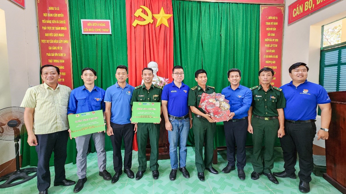 Tiếp theo, chuyến xe ghé thăm Đồn Biên phòng cửa khẩu Giang Thành. Đại diện Đoàn, đồng chí Phùng Thanh Tú, Bí thư Đoàn Thanh niên Cảng HKQT Tân Sơn Nhất đã thay mặt gửi lời hỏi thăm, chúc tết, tặng quà và nhu yếu phẩm cho đồng chí Đại diện Đồn.