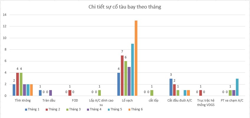 Qua biểu đồ, các sự cố tàu bay xảy ra tại Cảng chủ yếu bởi các nguyên nhân sau: Tàu bay lăn lố vạch dừng khi lăn vào các vị trí đỗ có hệ thống VDGS chiếm tỉ lệ cao nhất, chiếm 55.7%; Tàu bay bị chiếu đèn laser, tổ lái phát hiện có flycam/drone diễn ra thường xuyên và chiếm 20.3%; Nhân viên hàng không không chú ý quan sát trong quá trình điều khiển PT/TTB dẫn đến cắt đầu/đuôi tàu bay hoặc vi phạm khoảng cách an toàn tàu bay lăn, chiếm 10.1%; Đáng chú ý là các trường hợp phương tiện trang thiết bị phục vụ mặt đất va chạm tàu bay, gây tàu bay bị hư hỏng và ngưng khai thác, chiếm 6.3%.