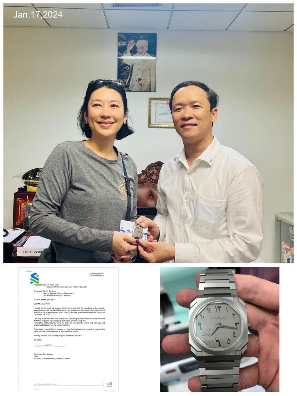 Đồng chí Đặng Xuân Vịnh, Đội trưởng Đội An ninh soi chiếu quốc tế, Cảng HKQT Tân Sơn Nhất đã kịp thời phát hiện, trả lại chiếc đồng hồ và nhận được thư cảm ơn từ hành khách.