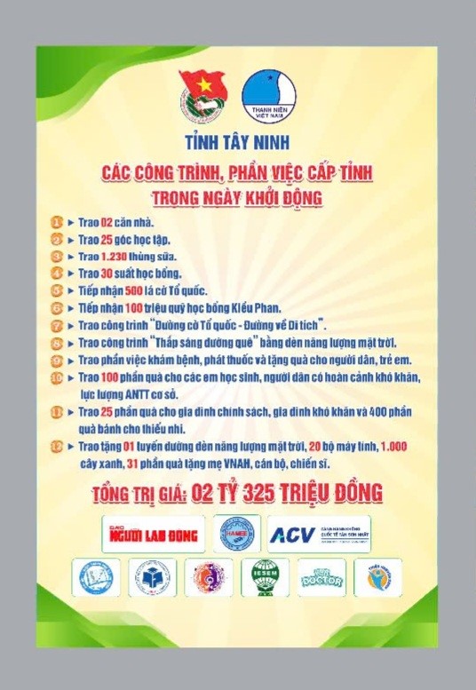 - Thực hiện công trình “Thắp sáng đường quê” bằng đèn năng lượng mặt trời tại ấp Thạnh Sơn, xã Thạnh Tây, huyện Tân Biên, tỉnh Tây Ninh với tuyến đường dài 03 km, tổng trị giá 30 triệu đồng.