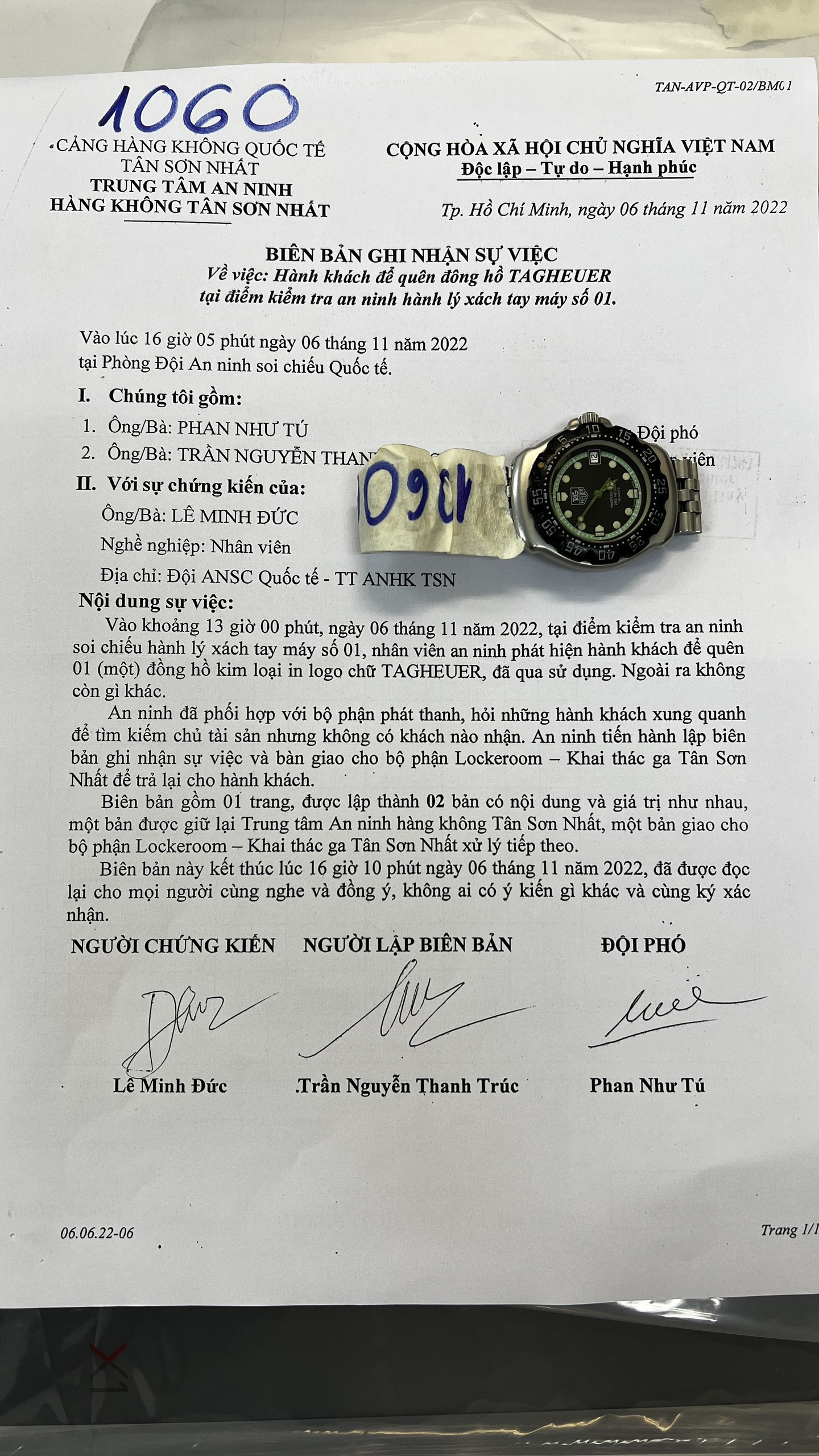 Ngày tiếp nhận: 09/11/2022 Mô tả: 01 đồng hồ dây da đen WISH DOIT. Vị trí: An ninh soi chiếu quốc tế |