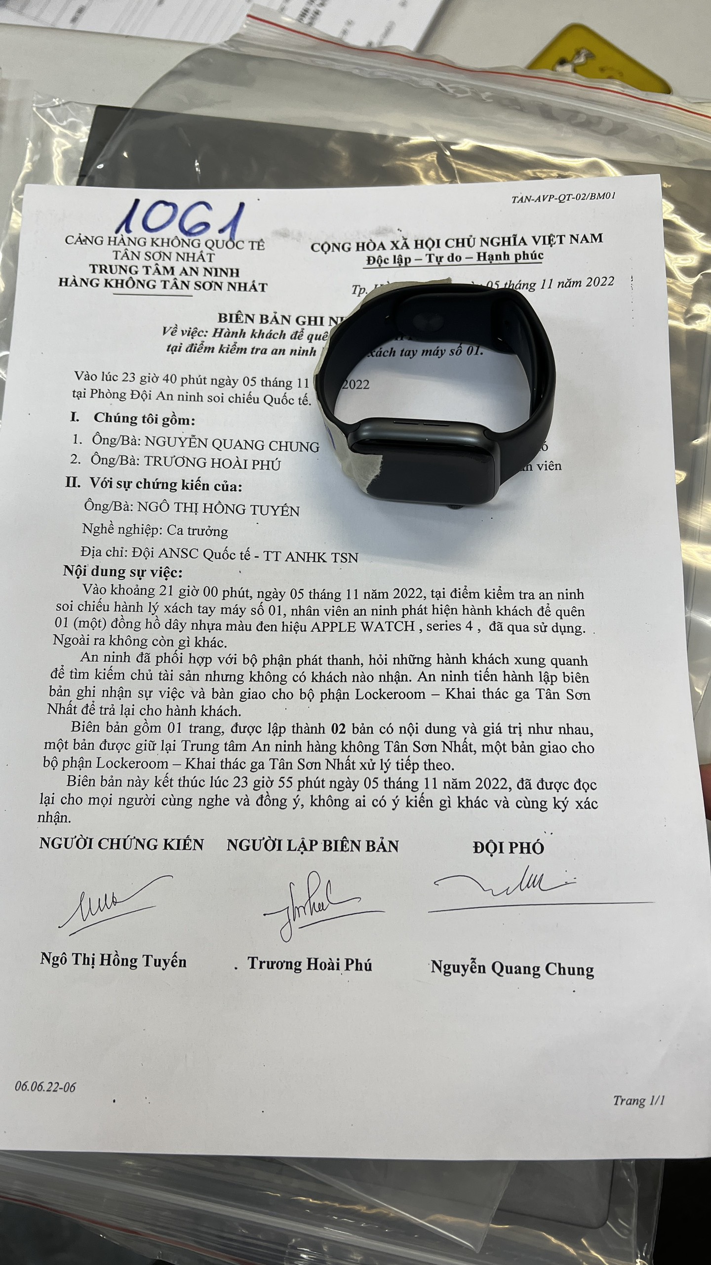 Ngày tiếp nhận: 09/11/2022 Mô tả: 01 đồng hồ APPLE. Vị trí: An ninh soi chiếu quốc tế |