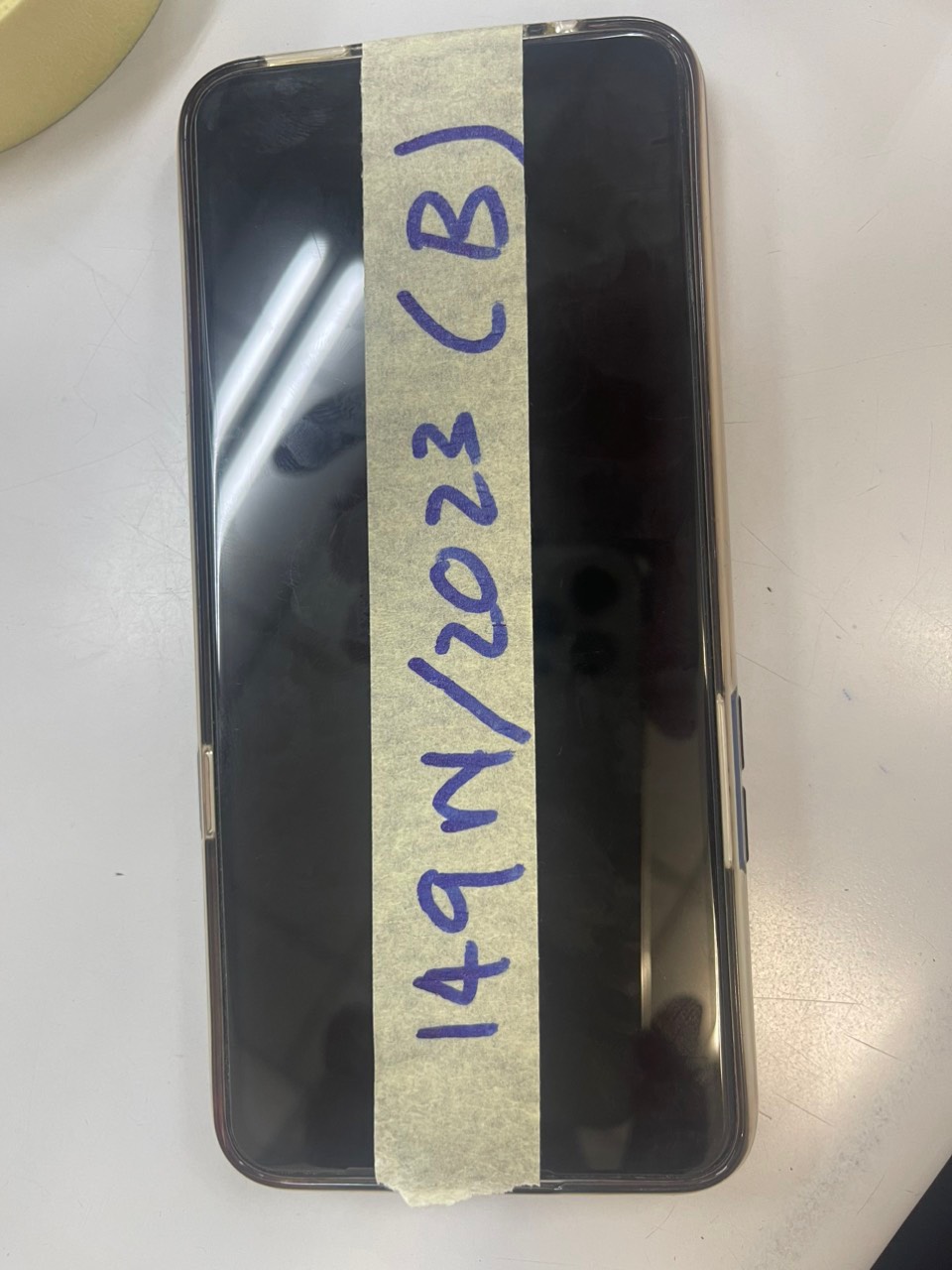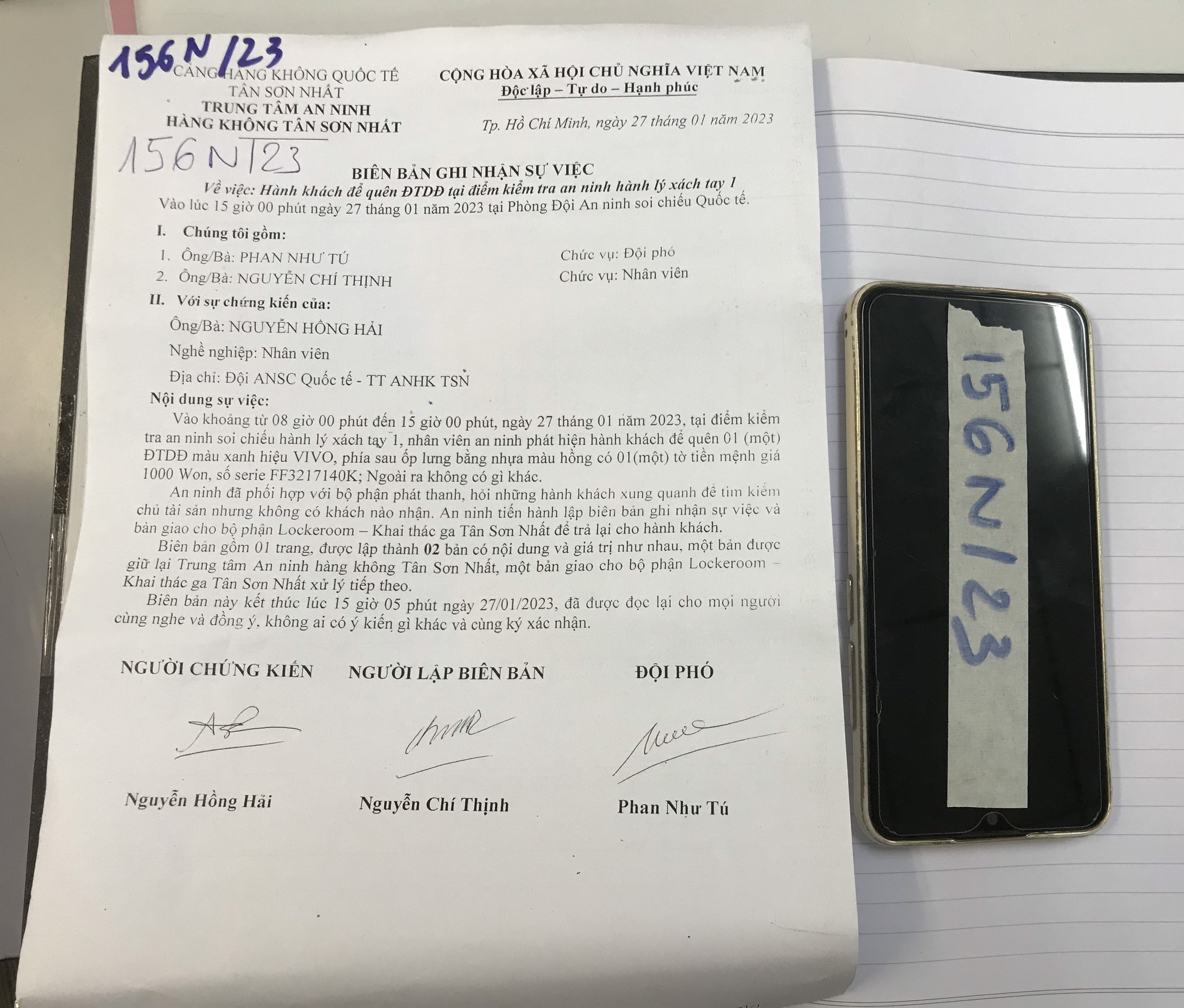 Ngày tiếp nhận: 29/01/2023 Mã hồ sơ: 156N2023 Mô tả: 01 Điện thoại di động màu xanh hiệu VIVO , ốp lưng nhựa màu hồng có 1 tờ tiền mệnh giá 1000 won, serie FF3217140K. Vị trí: An ninh soi chiếu quốc tế |