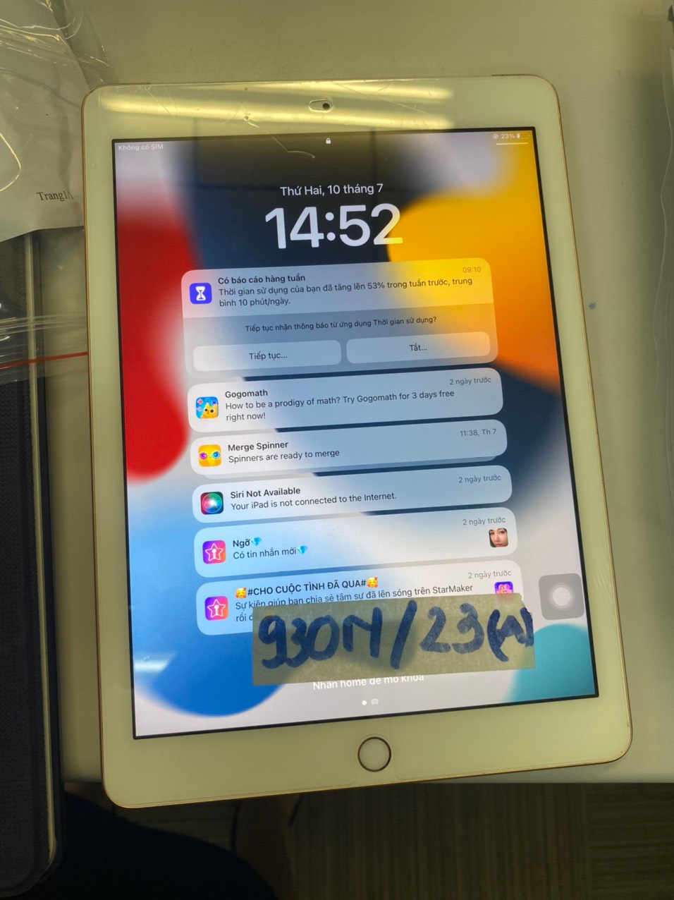 Ngày tiếp nhận: 09/07/2023 Mã hồ sơ: 930N2023B Mô tả: 01 ipad màu trắng. Vị trí: An ninh soi chiếu quốc tế |