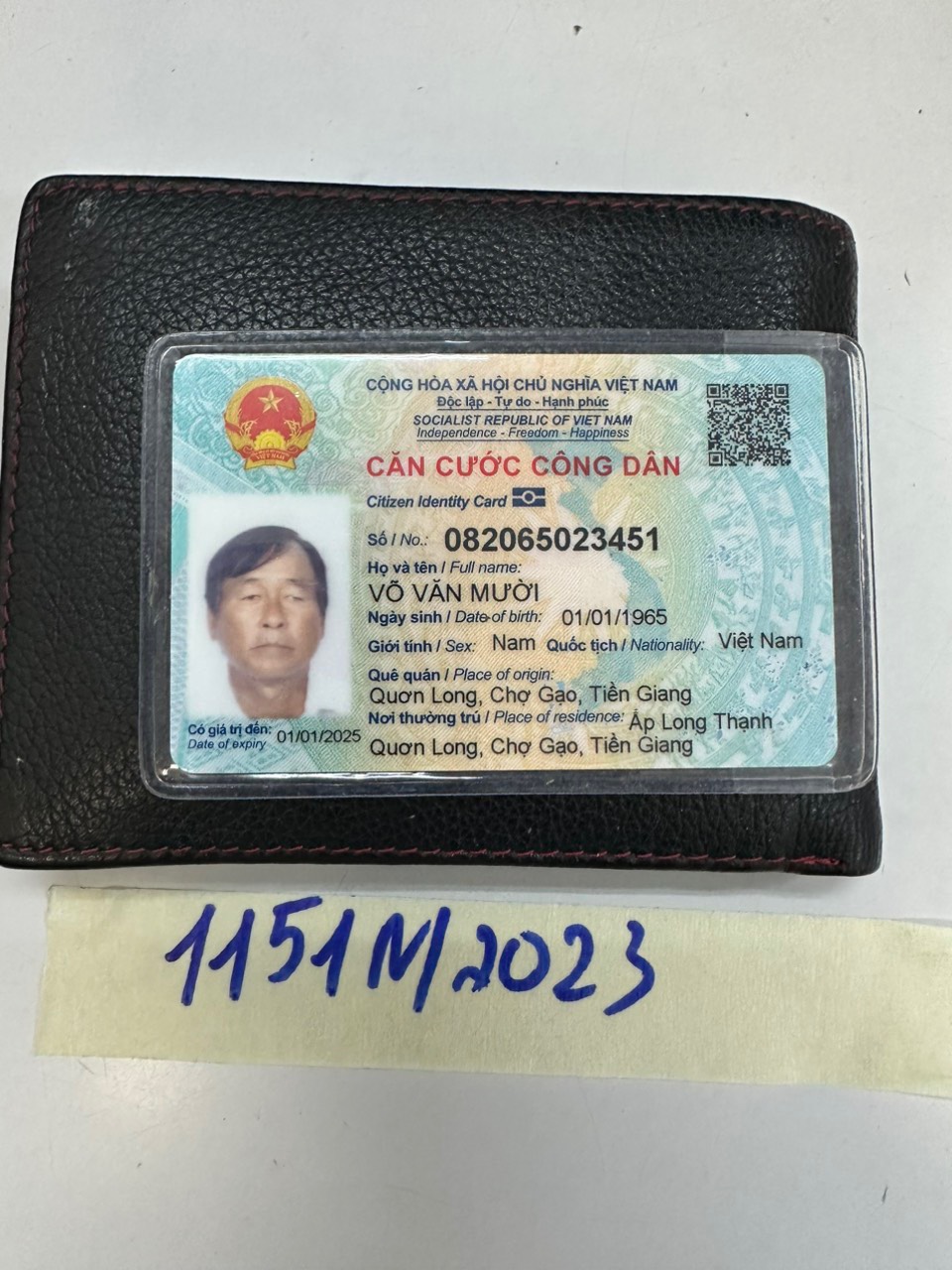 Ngày tiếp nhận: 15/8/2023 Mã hồ sơ: 1151N2023 Mô tả: 01 bóp da màu đen bên trong không có tiền, có một số giấy tờ tùy thân tên: VÕ VĂN MƯỜI. Vị trí: An ninh soi chiếu quốc tế |