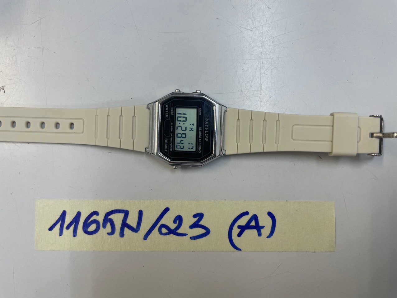Ngày tiếp nhận: 17/8/2023 Mã hồ sơ: 1165N2023A Mô tả: 01 đồng hồ dây nhựa màu trắng in logo BABYFLOW. Vị trí: An ninh soi chiếu quốc tế |
