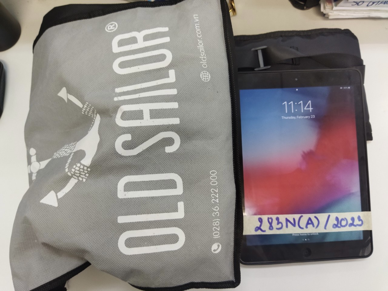 | 25 | Ngày tiếp nhận: 23/02/2023 Mã hồ sơ: 283N2023A Mô tả: 01 túi vải có chữ OLD SAILOR bên trong có 01 máy tính Ipad màu xám serial: DMPMT379FK11 kèm ốp lưng màu đen, một số vật dụng cá nhân đã qua sử dụng. Vị trí: An ninh soi chiếu quốc tế |