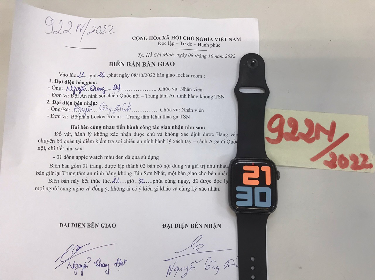Ngày tiếp nhận: 08/10/2022 Mô tả: 01 đồng hồ Apple Watch màu đen đã sử dụng. Vị trí: An ninh soi chiếu quốc nội |