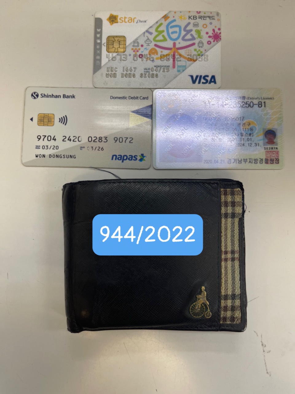 Ngày tiếp nhận: 13/10/2022 Mô tả: 01 ví nam có 01 bằng lái xe chữ Hàn Quốc, 01 thẻ ngân hàng Shinhan Bank tên Won Dong Sung, 01 thẻ visa tên Won Dong Sung. Vị trí: An ninh trật tự quốc tế |