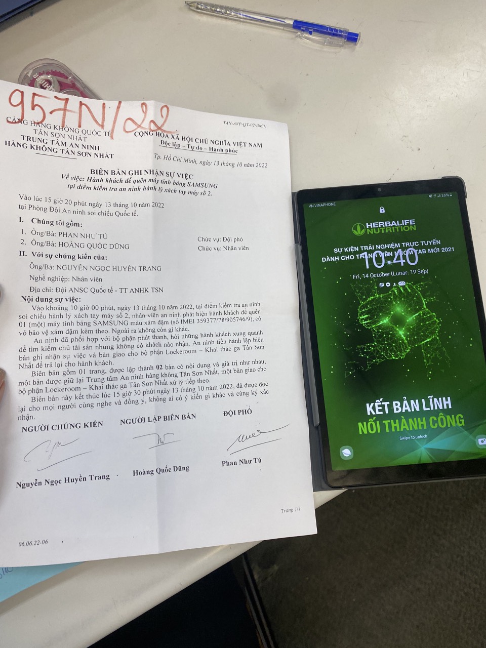 Ngày tiếp nhận: 14/10/2022 Mô tả: 01 máy tính bảng SAMSUNG màu xám đậm, imei: 359377/78/905746/9, có vỏ bảo vệ xám đậm. Vị trí: An ninh soi chiếu quốc tế |