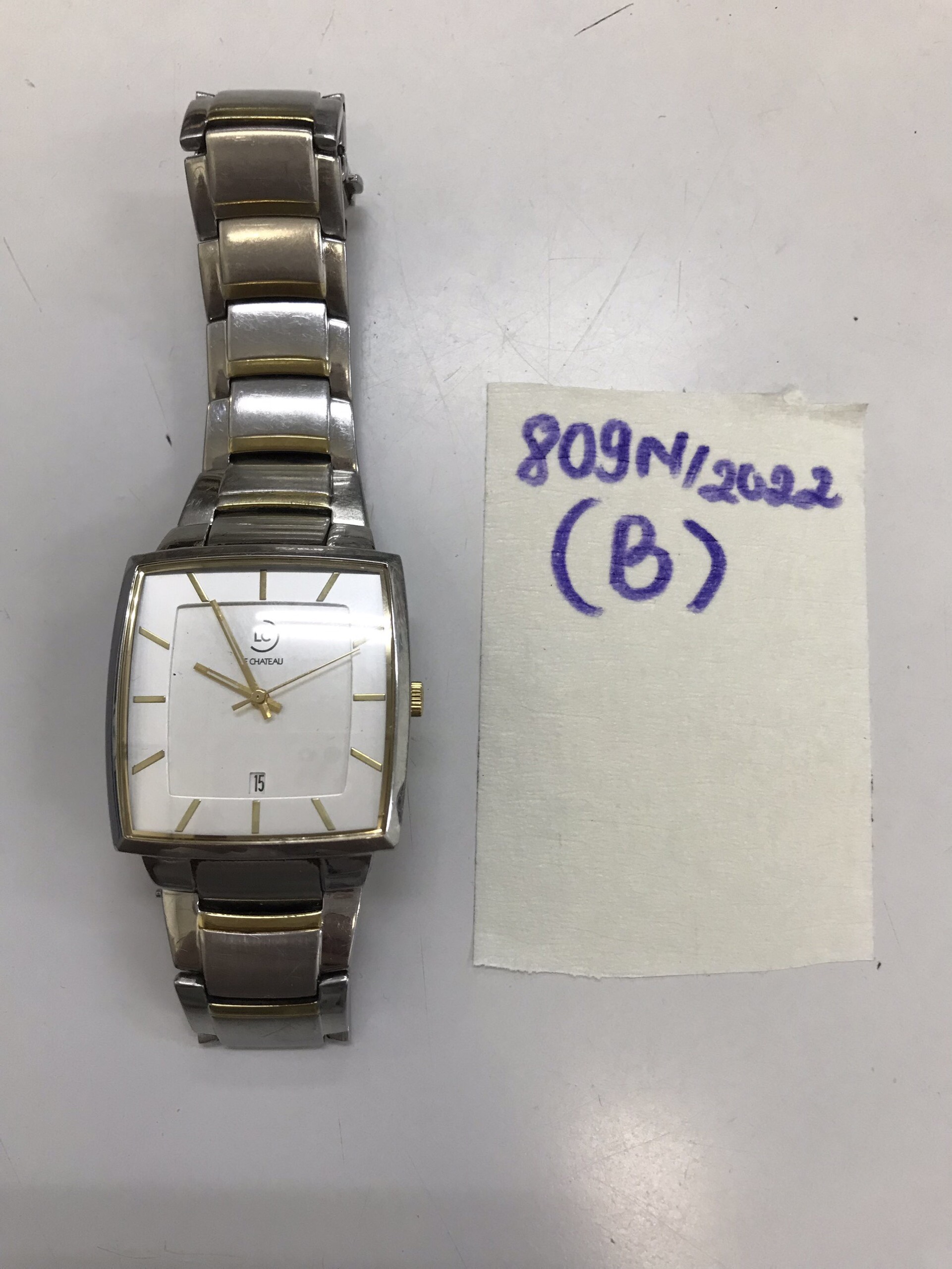 Ngày tiếp nhận: 15/9/2022 Mô tả: 01 đồng hồ dây kim loại màu trắng LE CHATEAU. Vị trí: An ninh soi chiếu quốc nội |