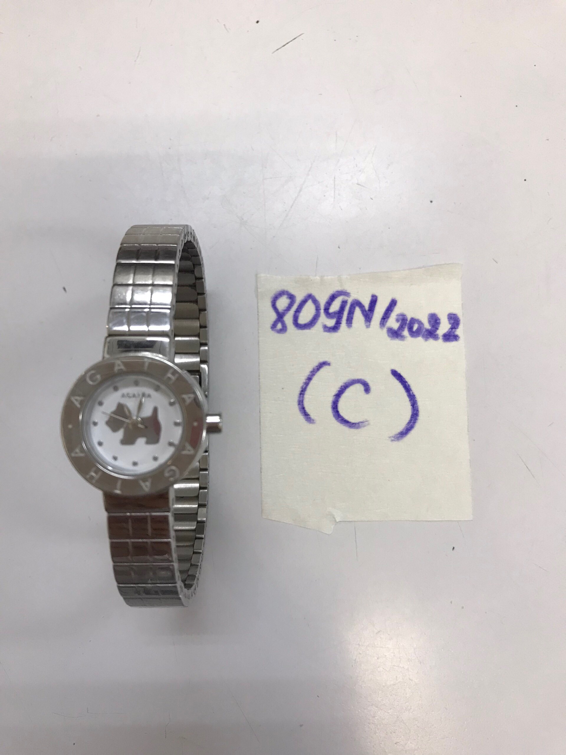 Ngày tiếp nhận: 15/9/2022 Mô tả: 01 đồng hồ dây kim loại màu trắng AGATHA. Vị trí: An ninh soi chiếu quốc nội |