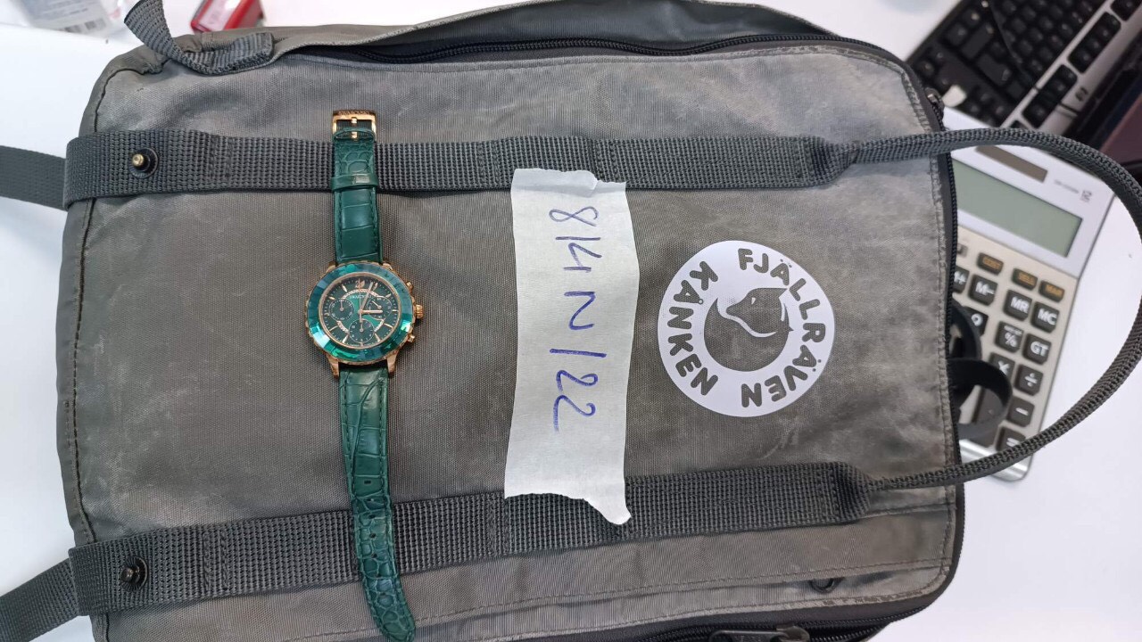 Ngày tiếp nhận: 18/9/2022 Mô tả: 01 balo màu xám có 01 đồng hồ da màu xanh Swarovski. Vị trí: An ninh soi chiếu quốc tế |