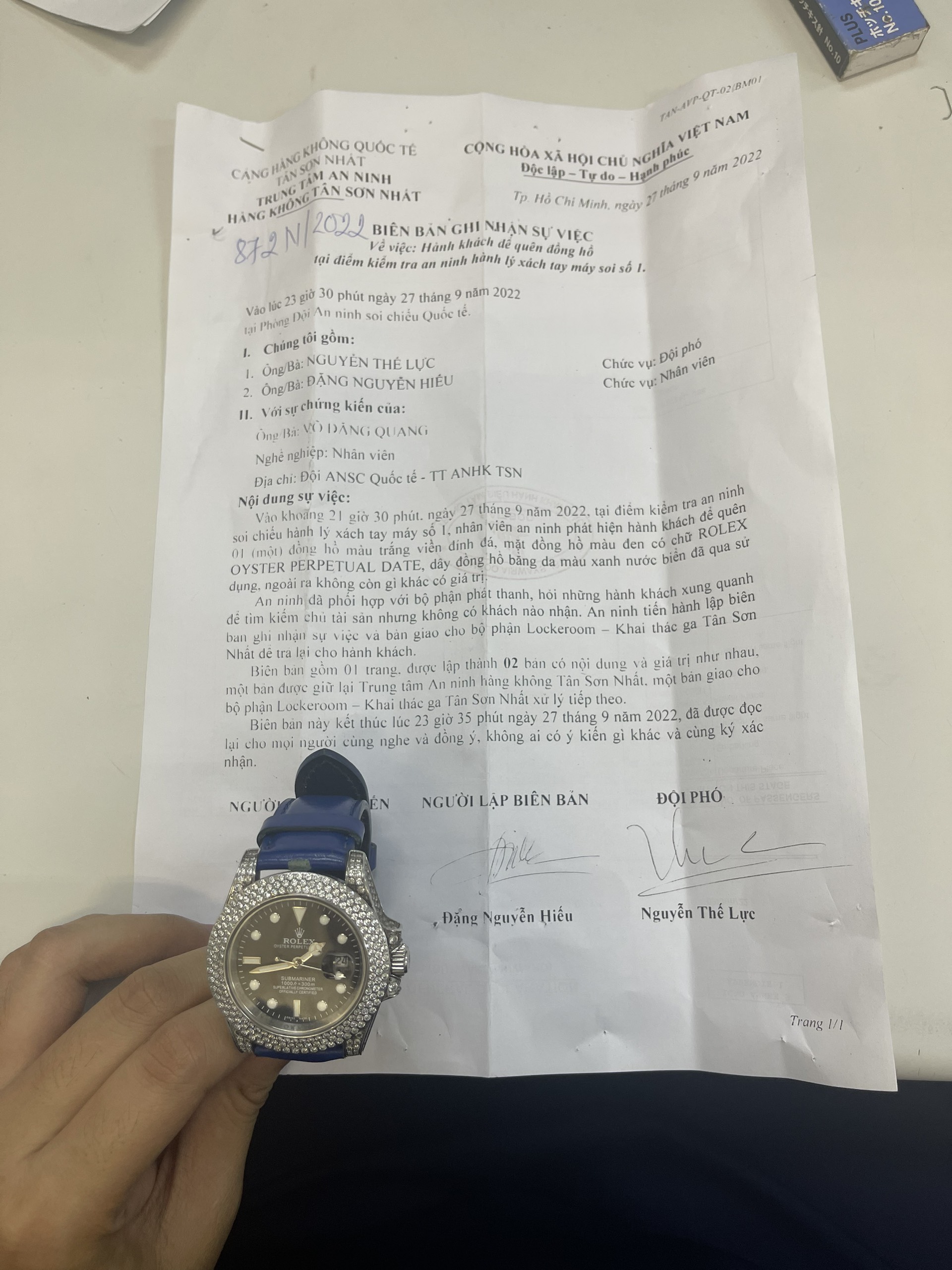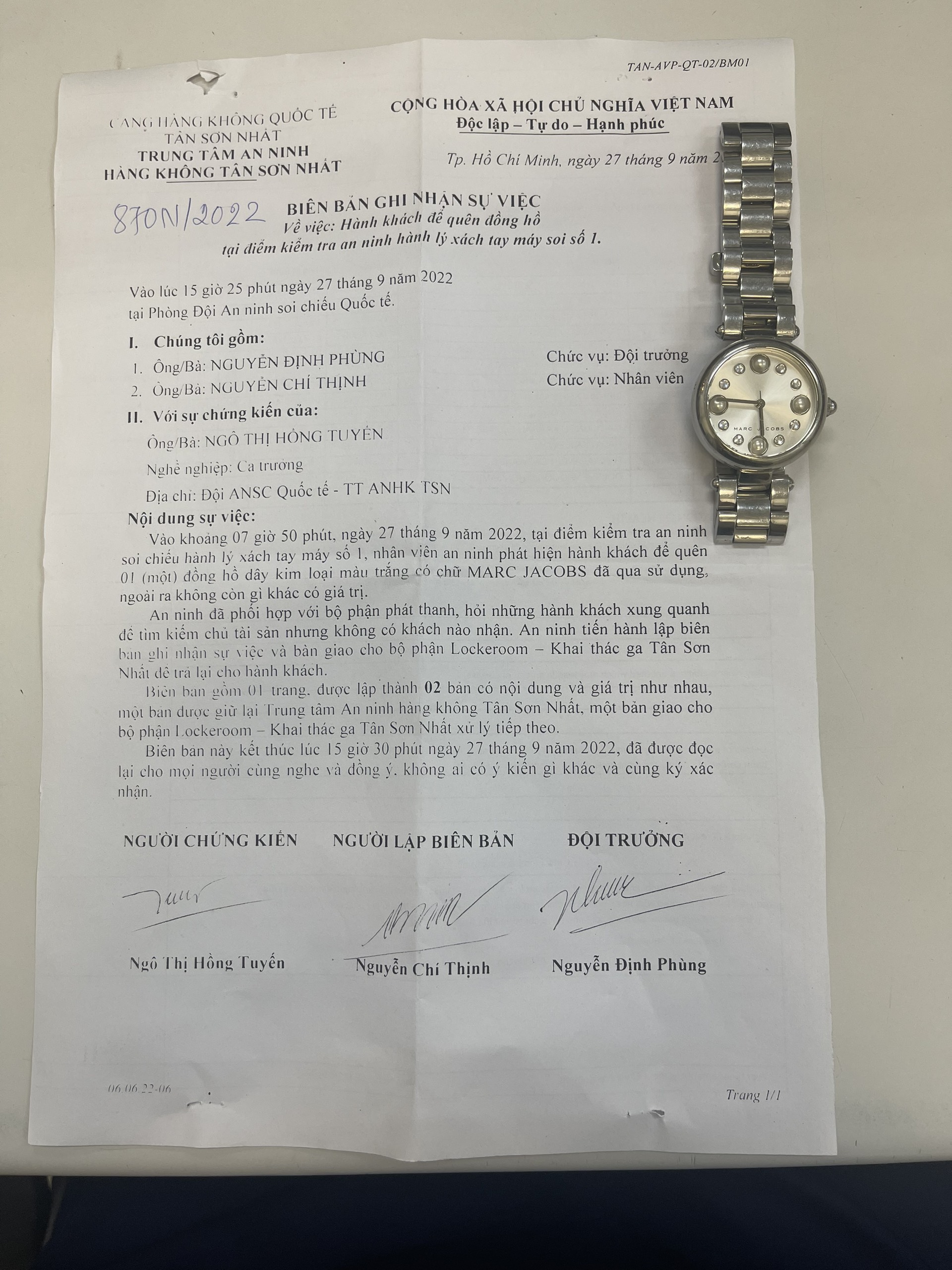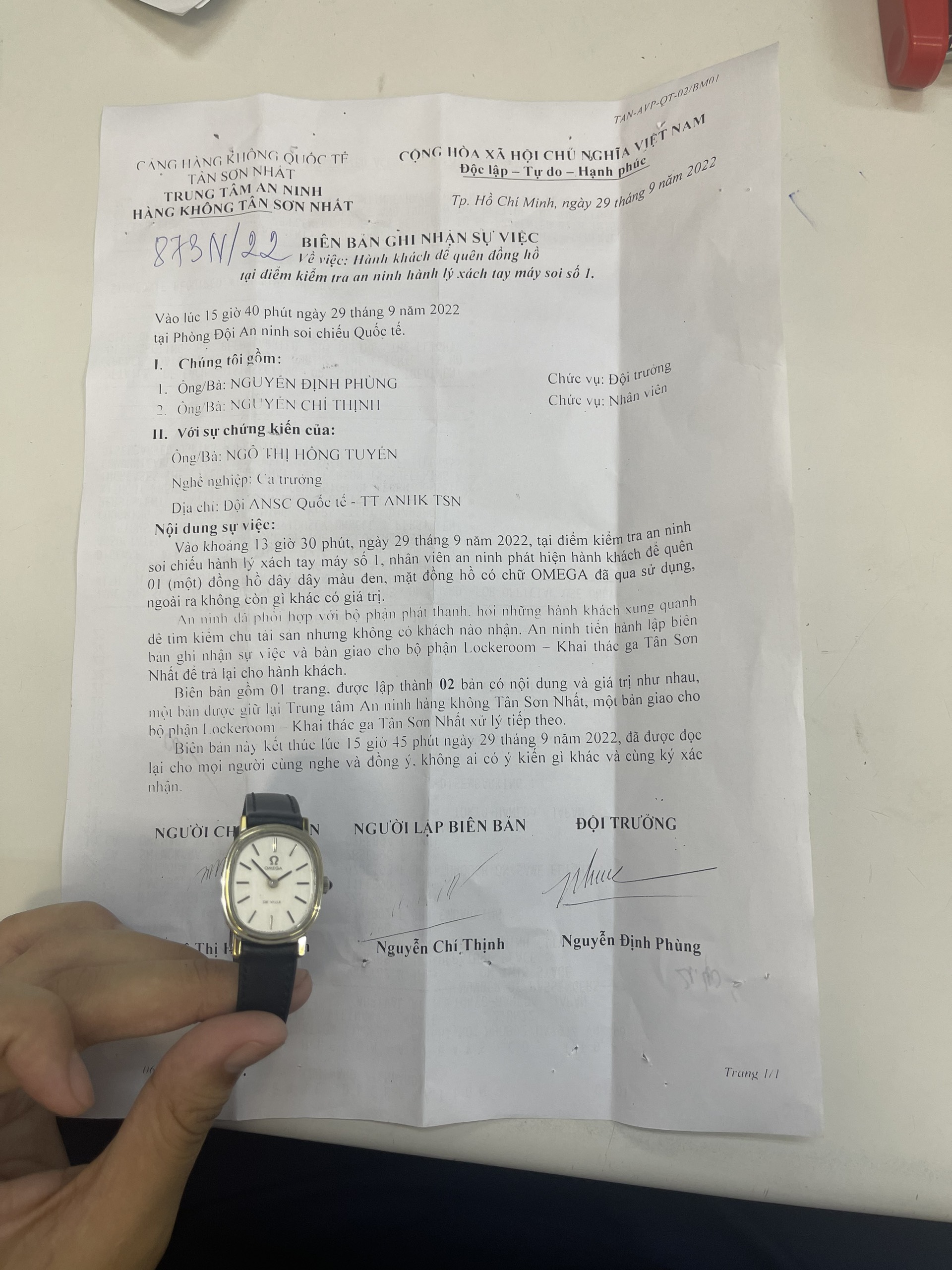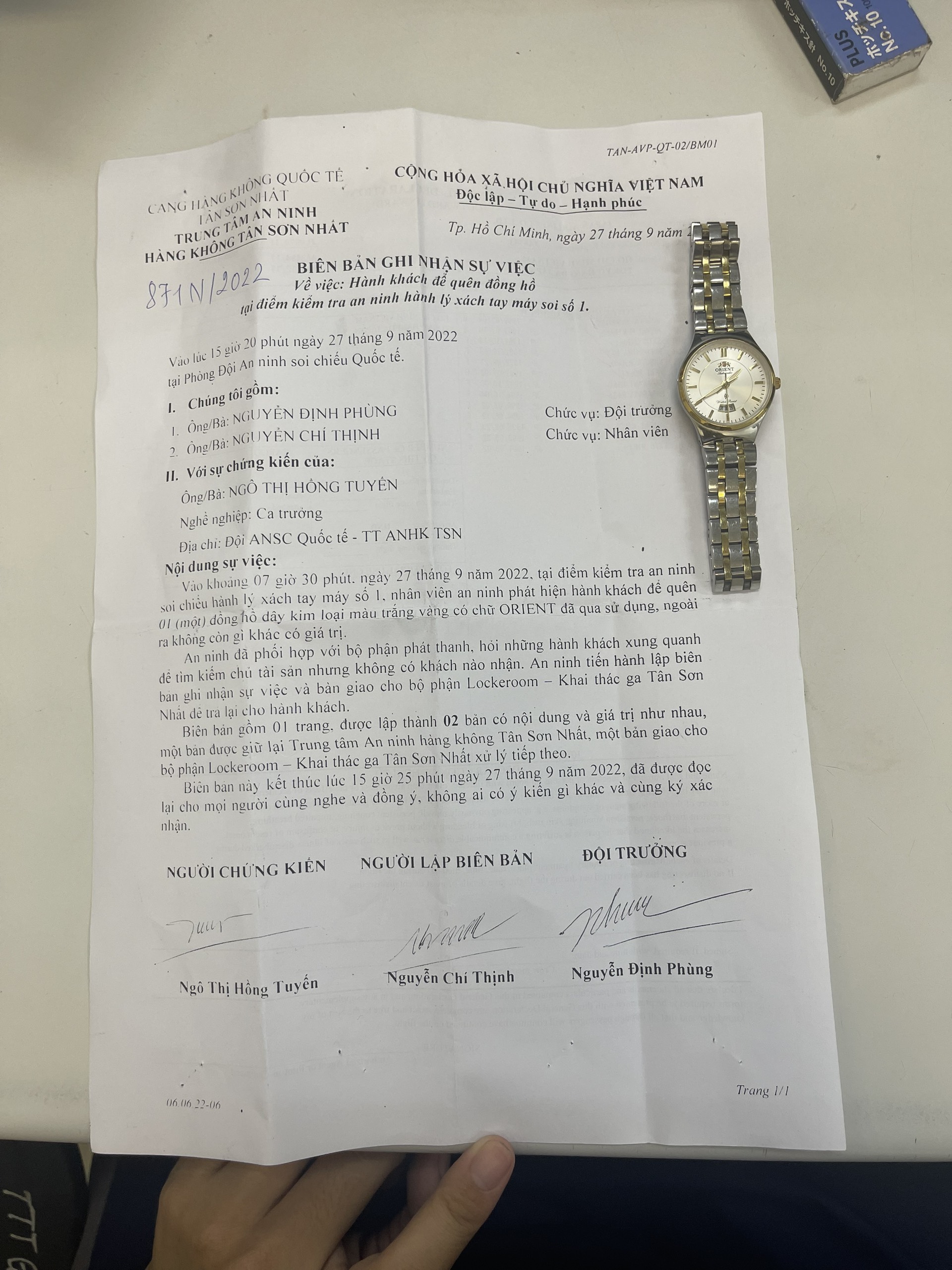 Ngày tiếp nhận: 27/9/2022 Mô tả: 01 đồng hồ dây da nâu Rate. Vị trí: An ninh soi chiếu quốc nội |