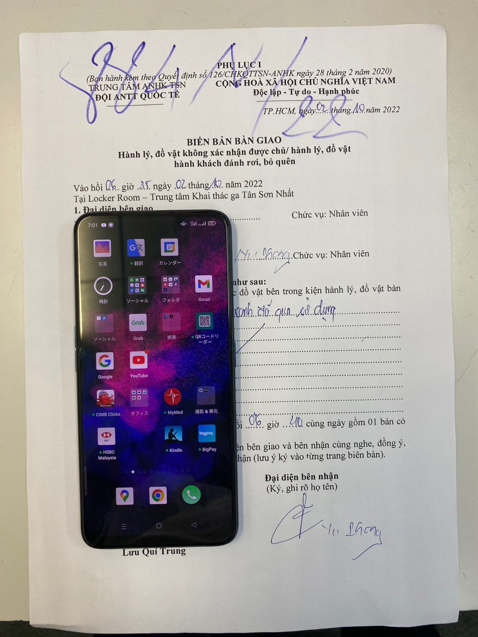 Ngày tiếp nhận: 01/10/2022 Mô tả: 01 điện thoại OPPO màu xanh đã sử dụng Vị trí: An ninh trật tự quốc tế |