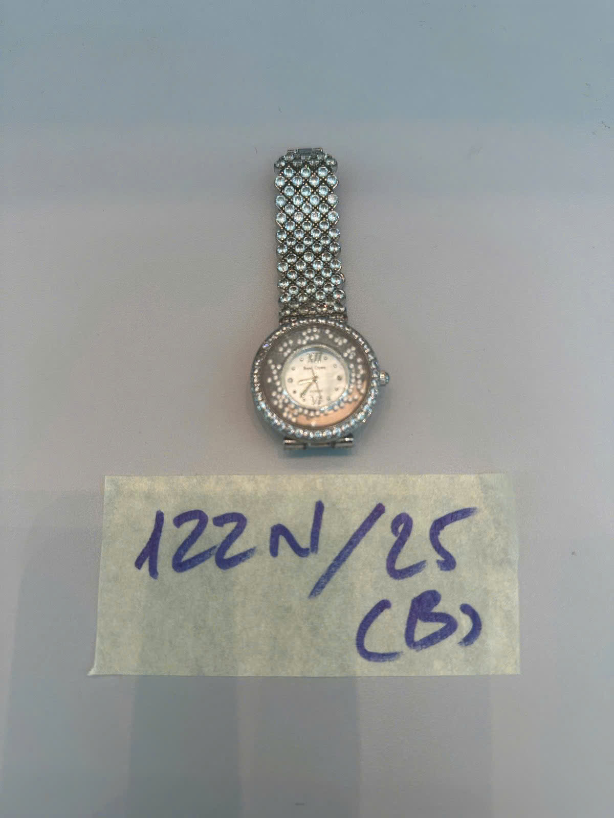 Ngày tiếp nhận: 10/12/2025 Mã hồ sơ: 122N2025B Mô tả: 01 đồng hồ màu bạc đính đá, mặt kim có chữ Royal Crown. |