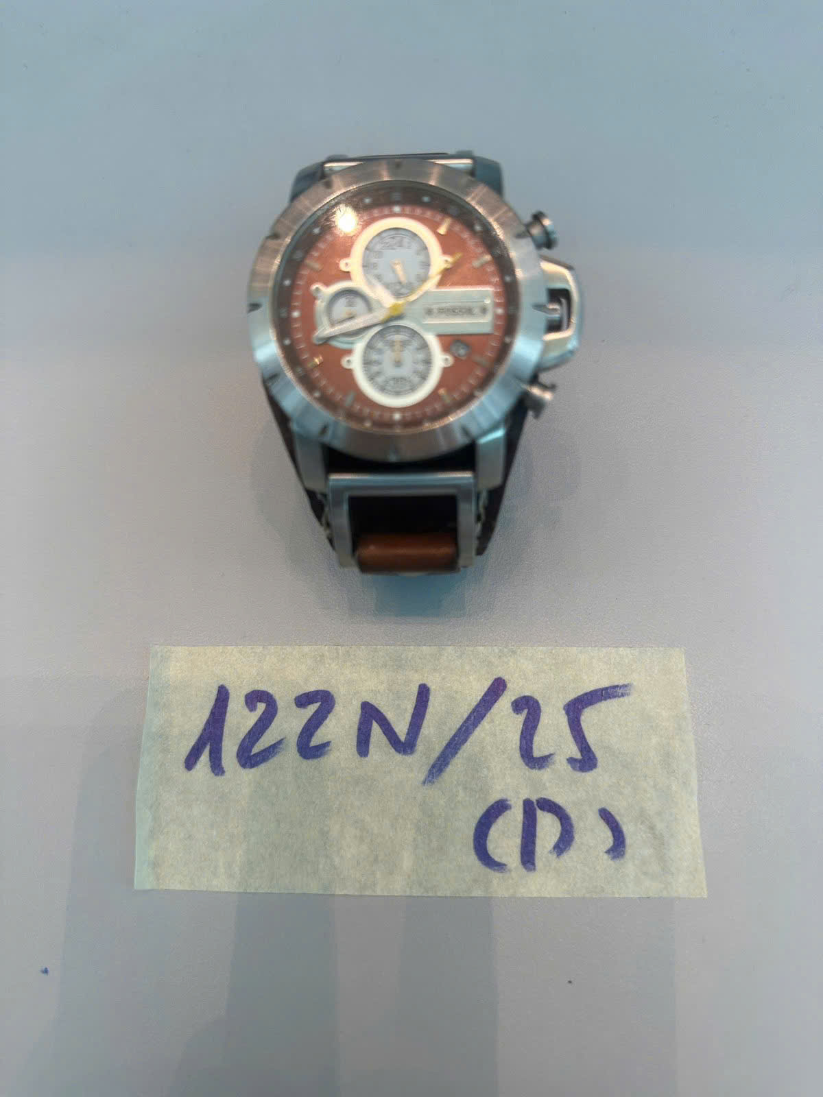 Ngày tiếp nhận: 10/12/2025 Mã hồ sơ: 122N2025D Mô tả: 01 đồng hồ dây da nâu, mặt kim loại màu trắng có chữ Fossil. |