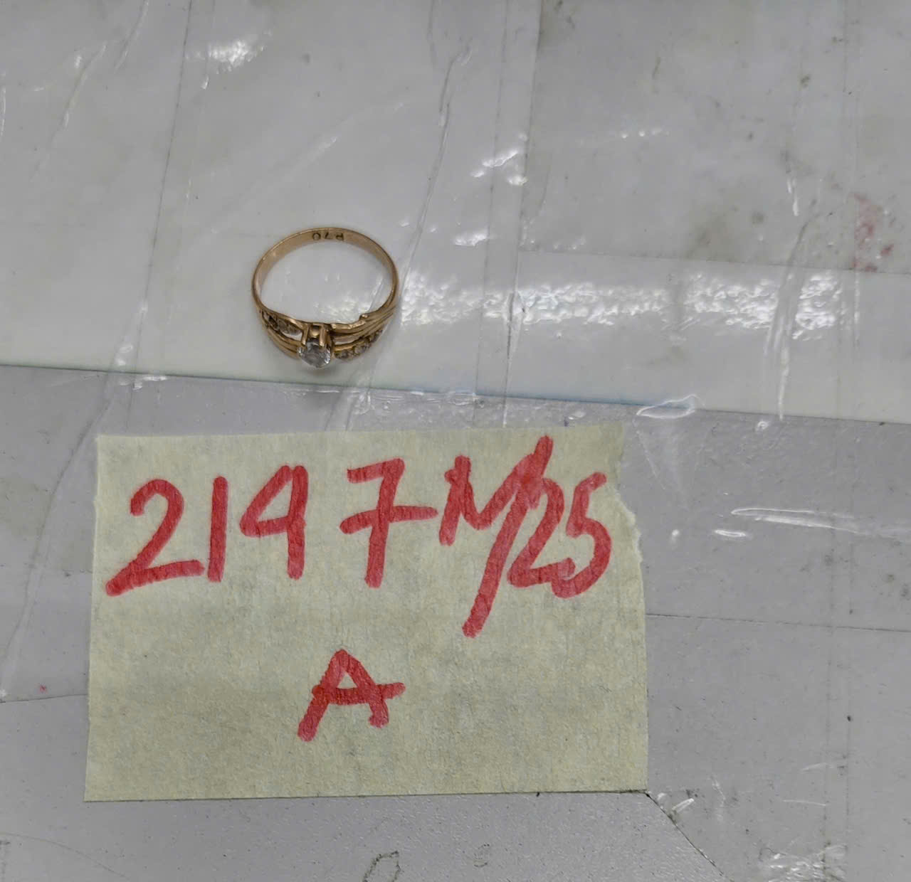 Ngày tiếp nhận: 09/12/2025 Mã hồ sơ: 2147N2025A Mô tả: 01 nhẫn kim loại màu vàng, có đính đá màu trắng. |