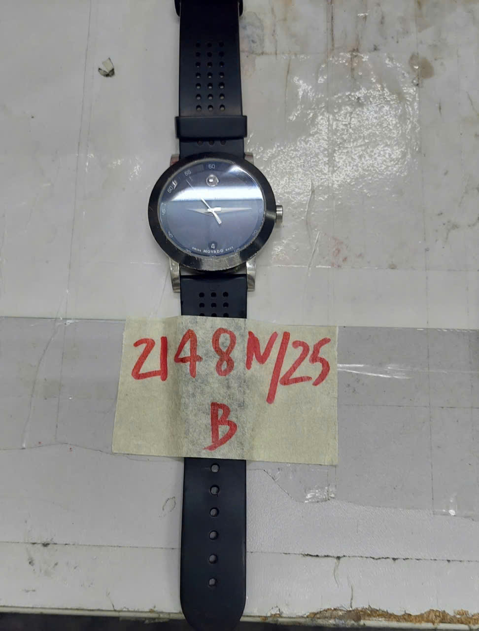 Ngày tiếp nhận: 09/12/2025 Mã hồ sơ: 2148N2025B Mô tả: 01 đồng hồ mặt tròn màu đen có chữ MOVADO, dây cao su màu đen. |