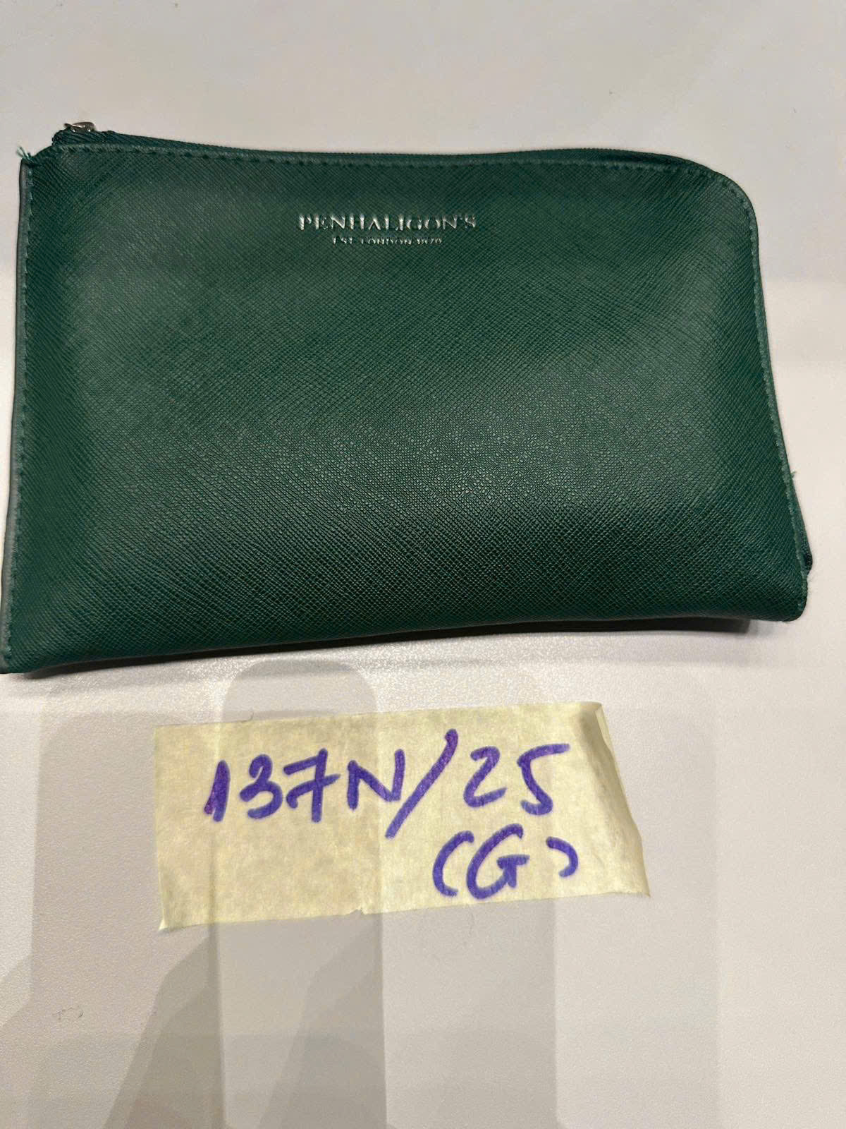 Ngày tiếp nhận: 17/12/2025 Mã hồ sơ: 137N2025G Mô tả: 01 ví da xanh lá cây có chữ PENHALIGON'S có 02 dây sạc và 01 củ sạc. |