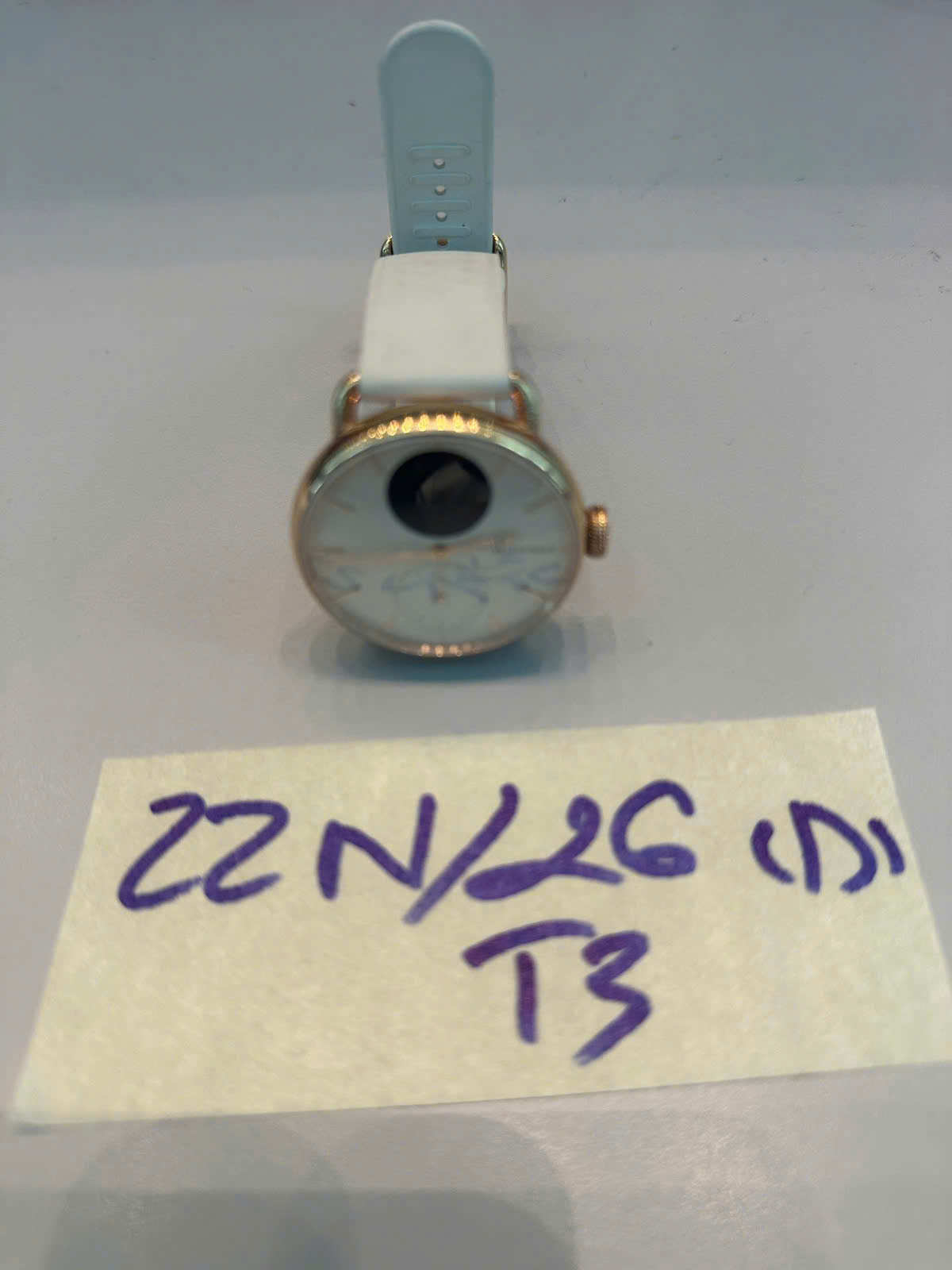 Mô tả: 01 đồng hồ mặt tròn màu vàng đồng có chữ withings dây cao su màu trắng đã qua sử dụng.