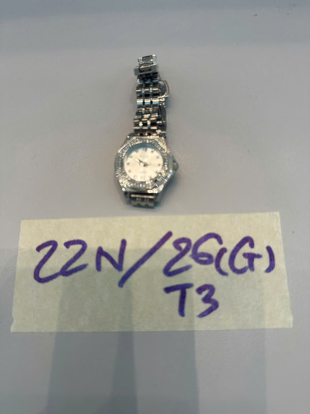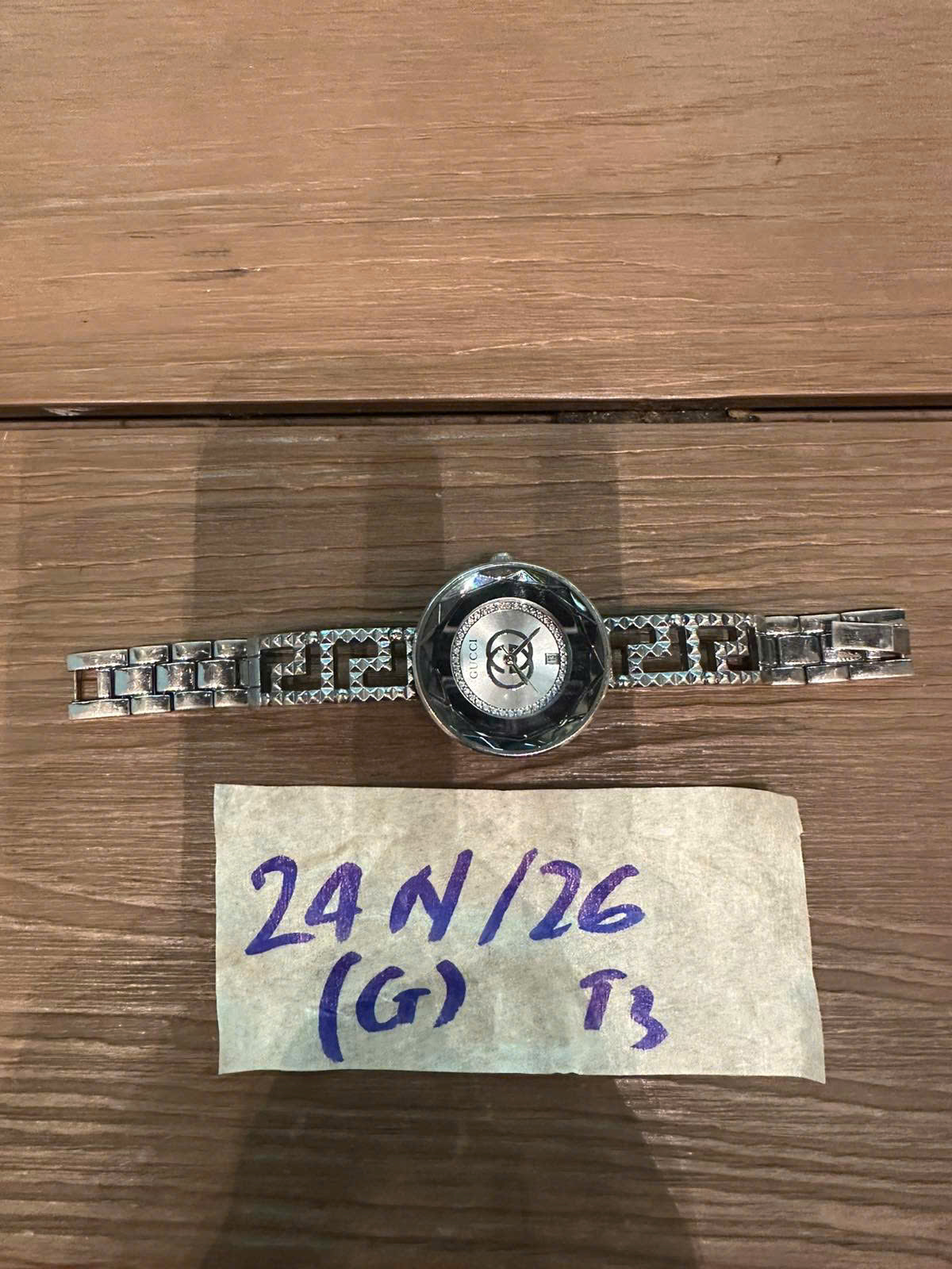 Mô tả: 01 đồng hồ dây kim loại, mặt tròn có chữ GUCCI.