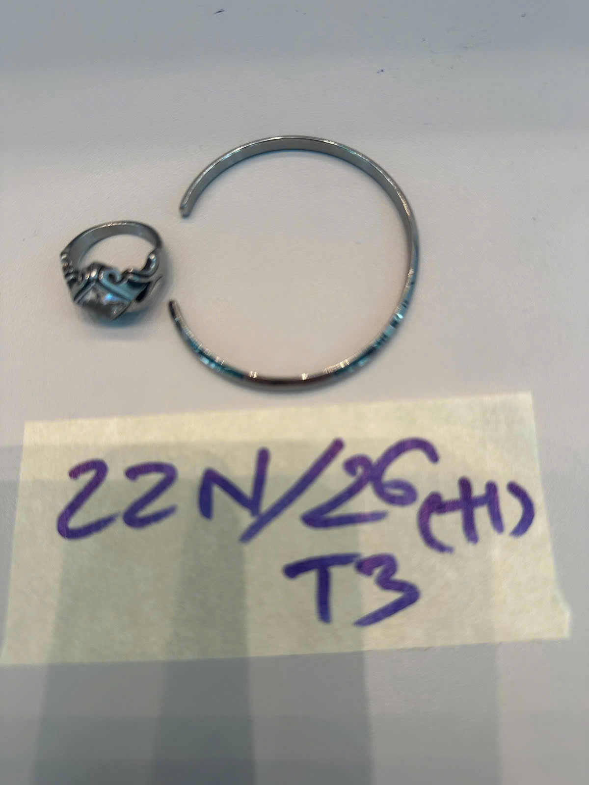 Mô tả: 01 nhẫn kim loại màu xám bạc trên có đính đá  + 01 vòng tay hở bằng kim loại bạc.