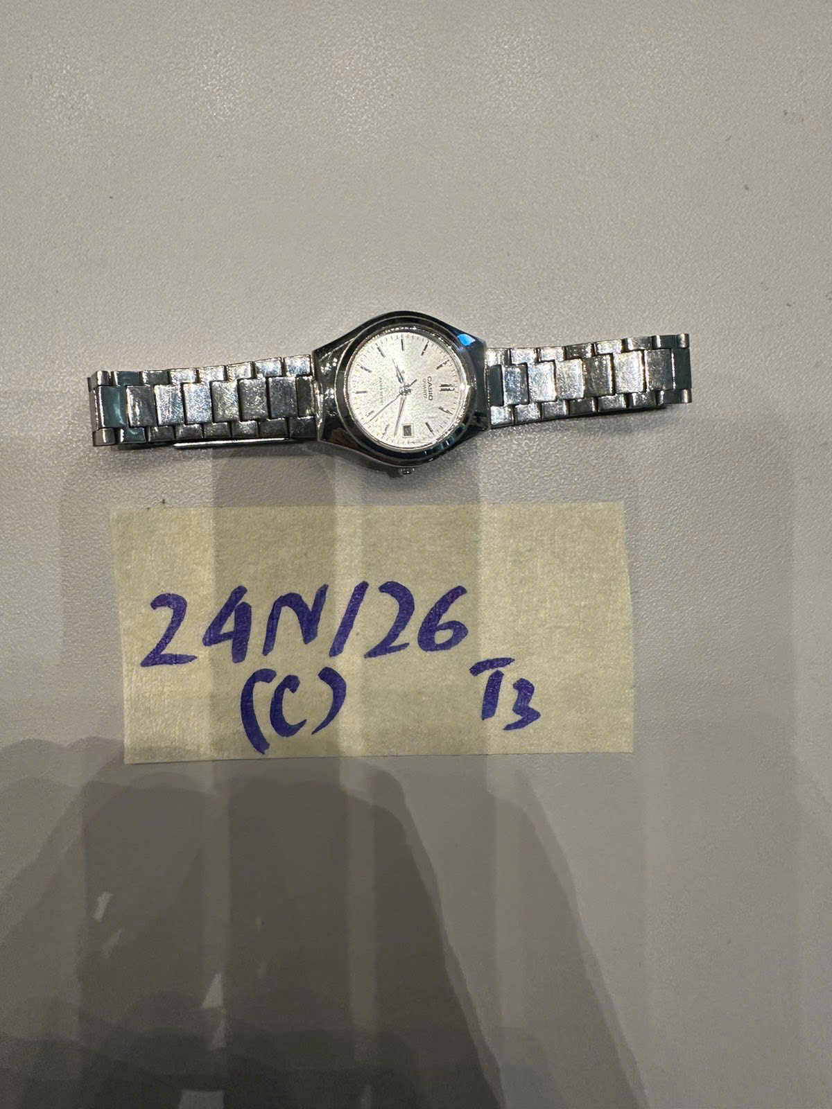Mô tả: 01 đồng hồ kim loại màu bạc ghi chữ CASIO QUART.