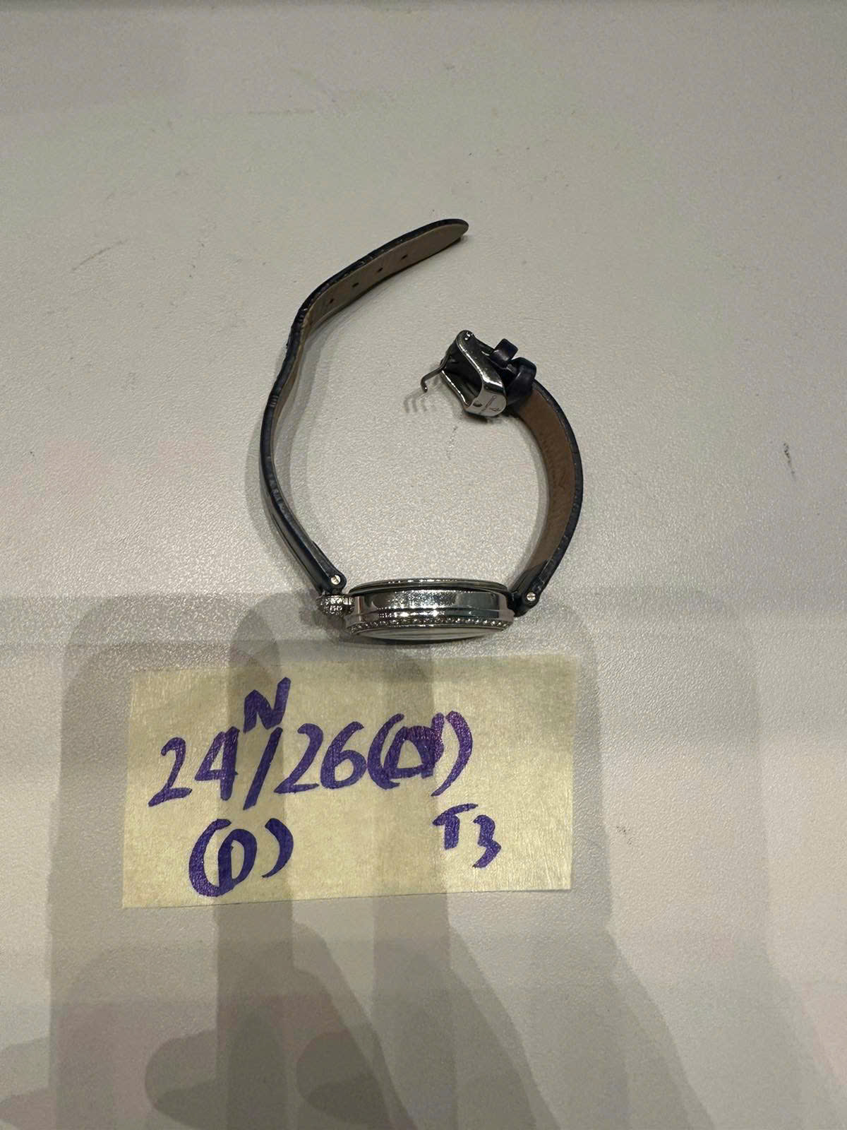 Mô tả: 01 đồng hồ kim loại màu trắng, dây da màu xanh đen (CU4292).