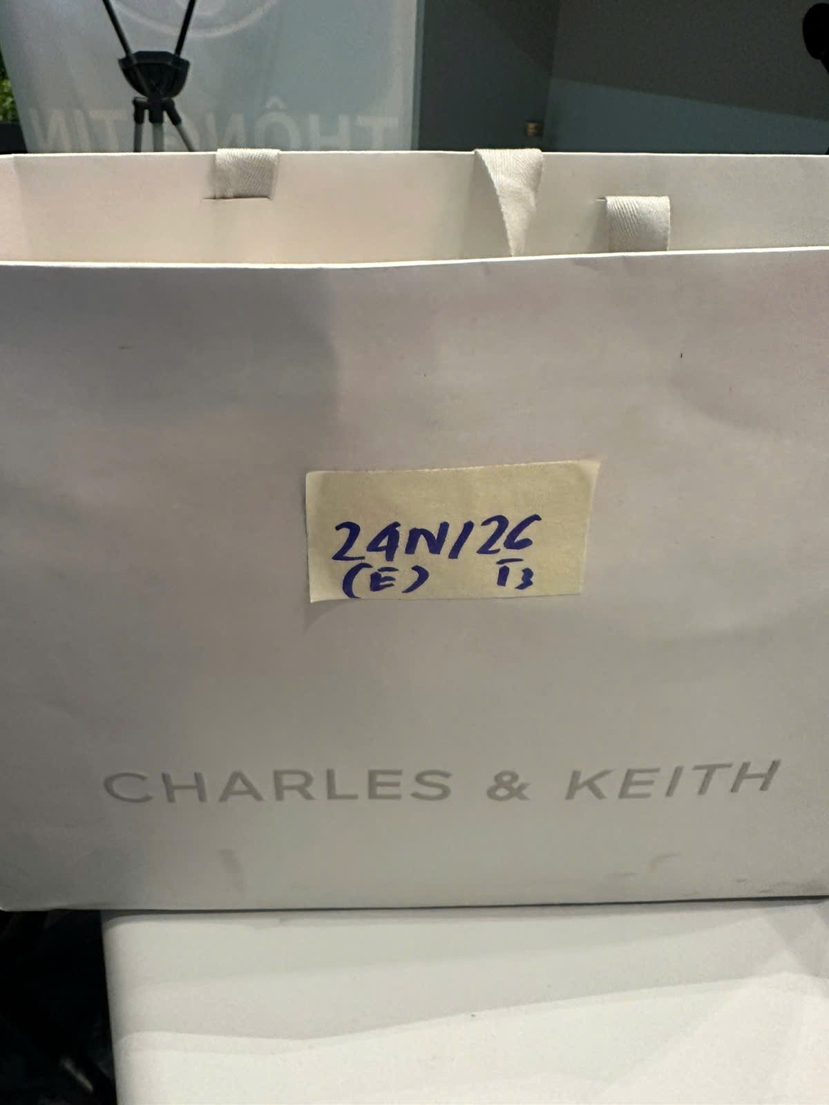 Mô tả: 01 túi giấy màu trắng có 01 đôi giày đa màu đen có chữ GEOX RESPINA.