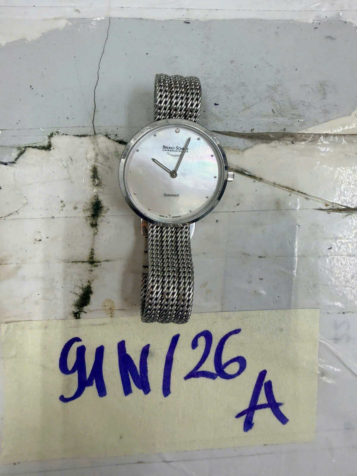 Ngày tiếp nhận: 20/01/2026 Mã hồ sơ: 91N2026A Mô tả: 01 đồng hồ mặt tròn màu bạc có chữ “BRUNO SOHNLE”, dây đeo bằng kim loại màu bạc. |