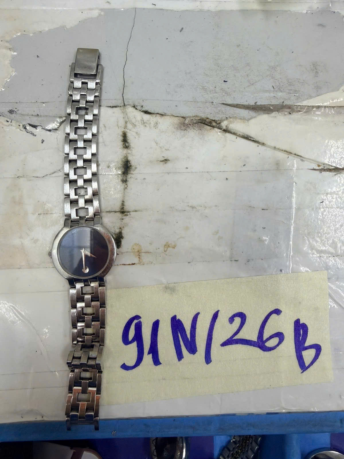 Ngày tiếp nhận: 20/01/2026 Mã hồ sơ: 91N2026B Mô tả: 01 đồng hồ mặt tròn màu xanh đậm có chữ “MOVADO”, dây đeo bằng kim loại màu bạc. |