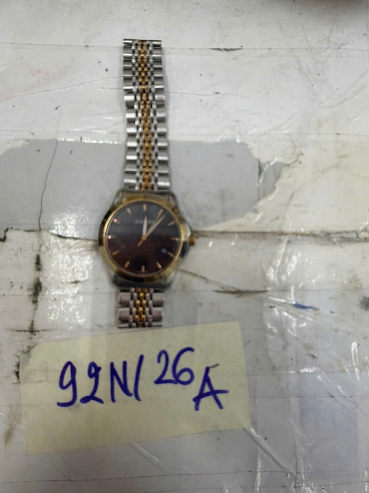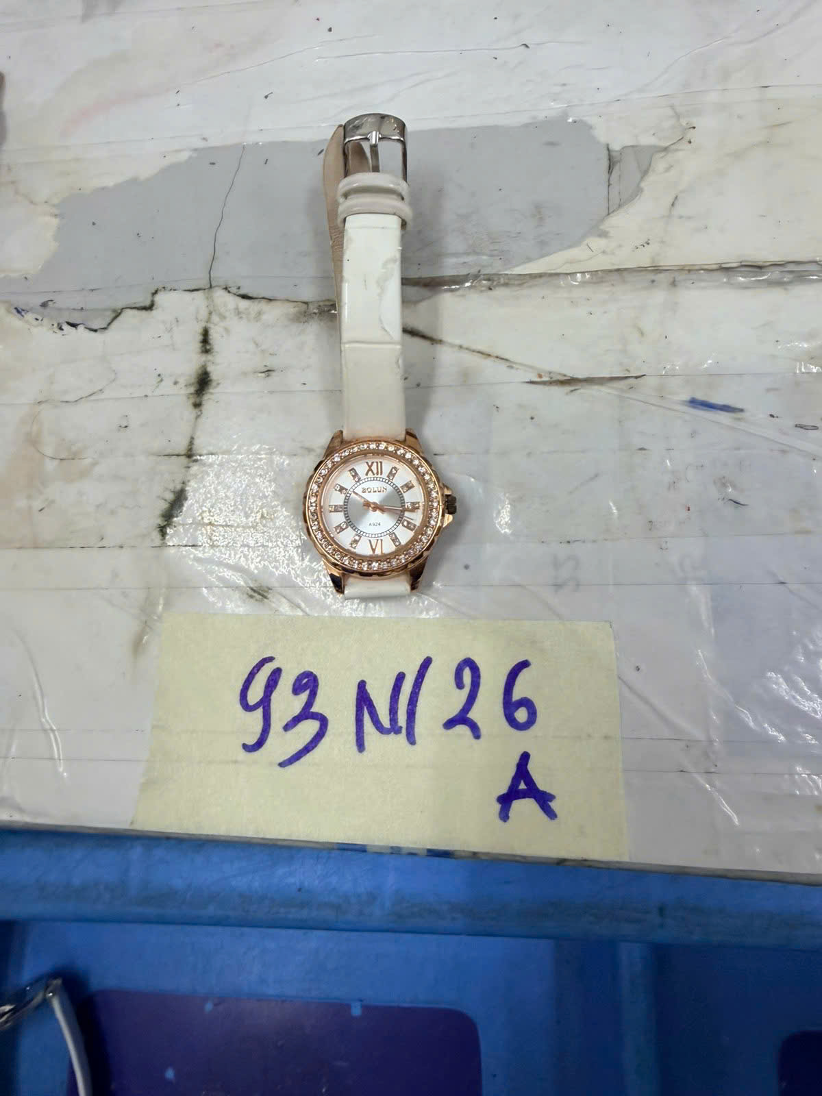 Ngày tiếp nhận: 20/01/2026 Mã hồ sơ: 93N2026A Mô tả: 01 đồng hồ kim loại mặt tròn màu vàng hồng có đính đá, mặt có chữ “BOLUN”, dây đeo bằng da màu trắng. |