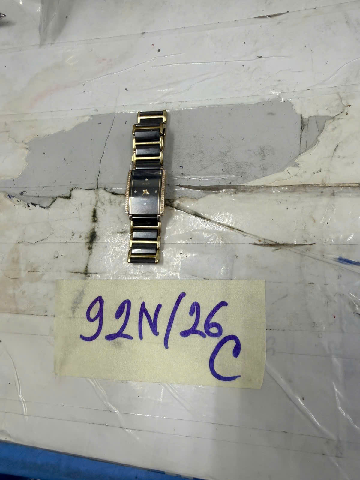 Ngày tiếp nhận: 20/01/2026 Mã hồ sơ: 92N2026C Mô tả: 01 đồng hồ mặt hình chữ nhật màu đen vàng có chữ “RADO”, dây kim loại màu đen/vàng. |