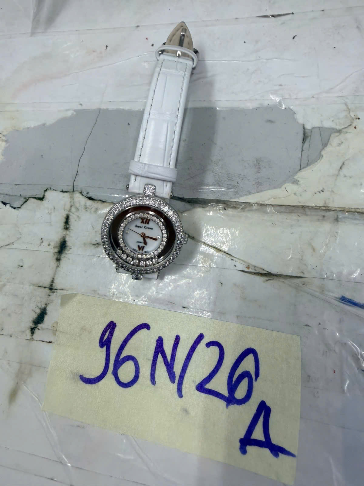 Ngày tiếp nhận: 20/01/2026 Mã hồ sơ: 96N2026A Mô tả: 01 đồng hồ mặt hình tròn màu trắng có chữ Royal Crown, viền đính đá màu trắng, dây đeo da màu trắng. |