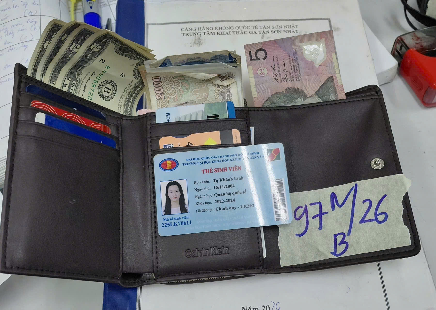 Ngày tiếp nhận: 20/01/2026 Mã hồ sơ: 97N2026B Mô tả: 01 bóp da màu kem chữ Calvin Klein có nhiều thẻ nhựa tên Tạ Khánh Linh + 41.000 VND + 8 USD, 5 AUD. |