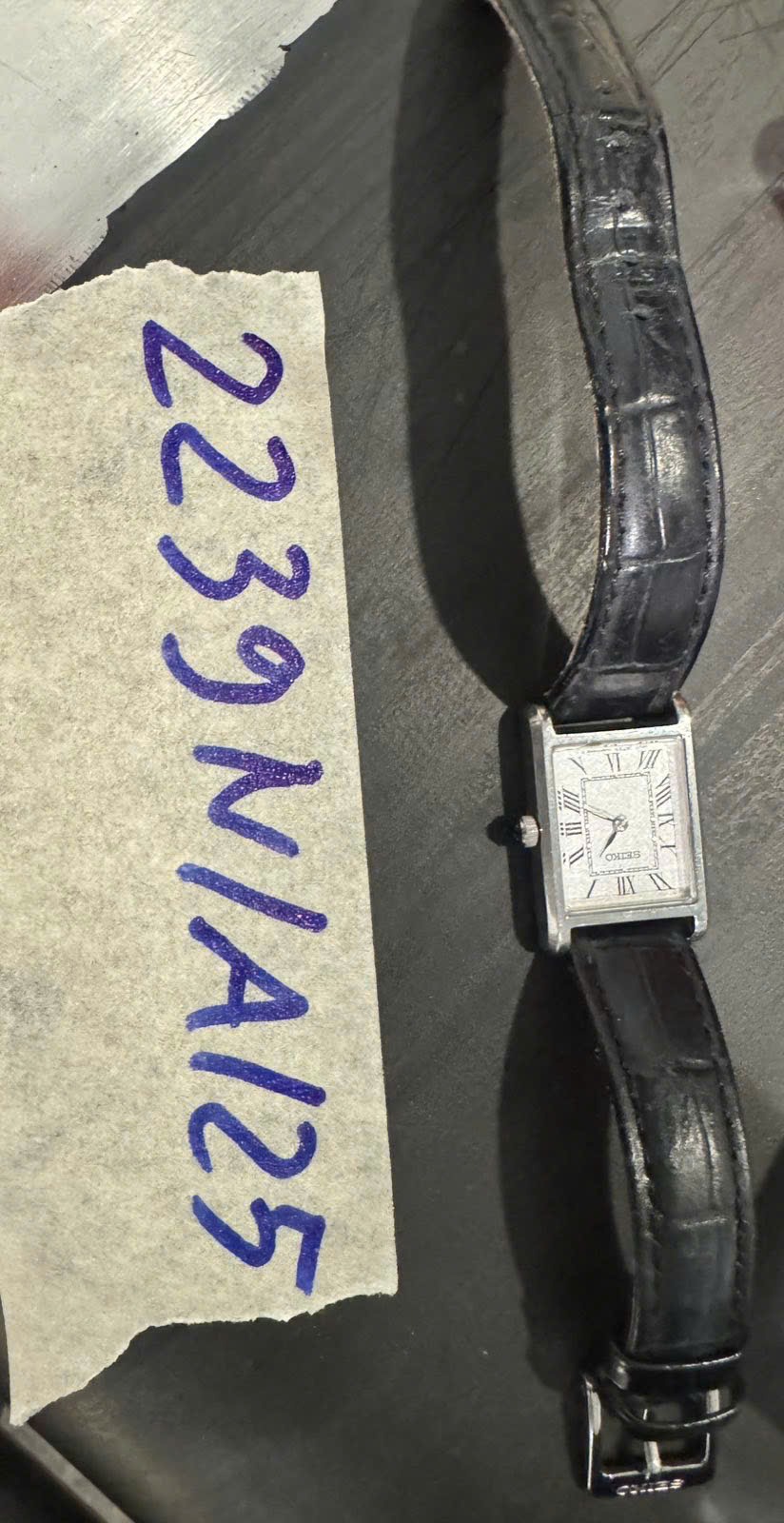 Ngày tiếp nhận: 30/12/2025 Mã hồ sơ: 2239N2025A Mô tả: 01 SEIKO MẶT VUÔNG MÀU BẠC DAY DA ĐEN. |
