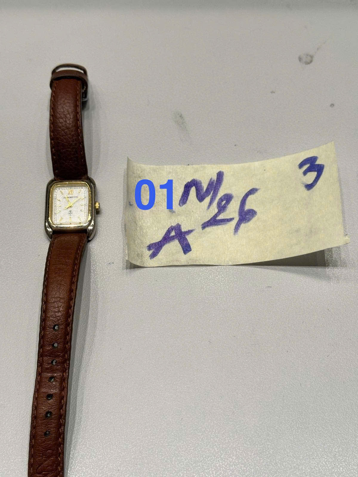 Ngày tiếp nhận: 01/01/2026 Mã hồ sơ: 01N2025A Mô tả: 01 đồng hồ mặt vuông dây da có chữ ZANOBETTI. |