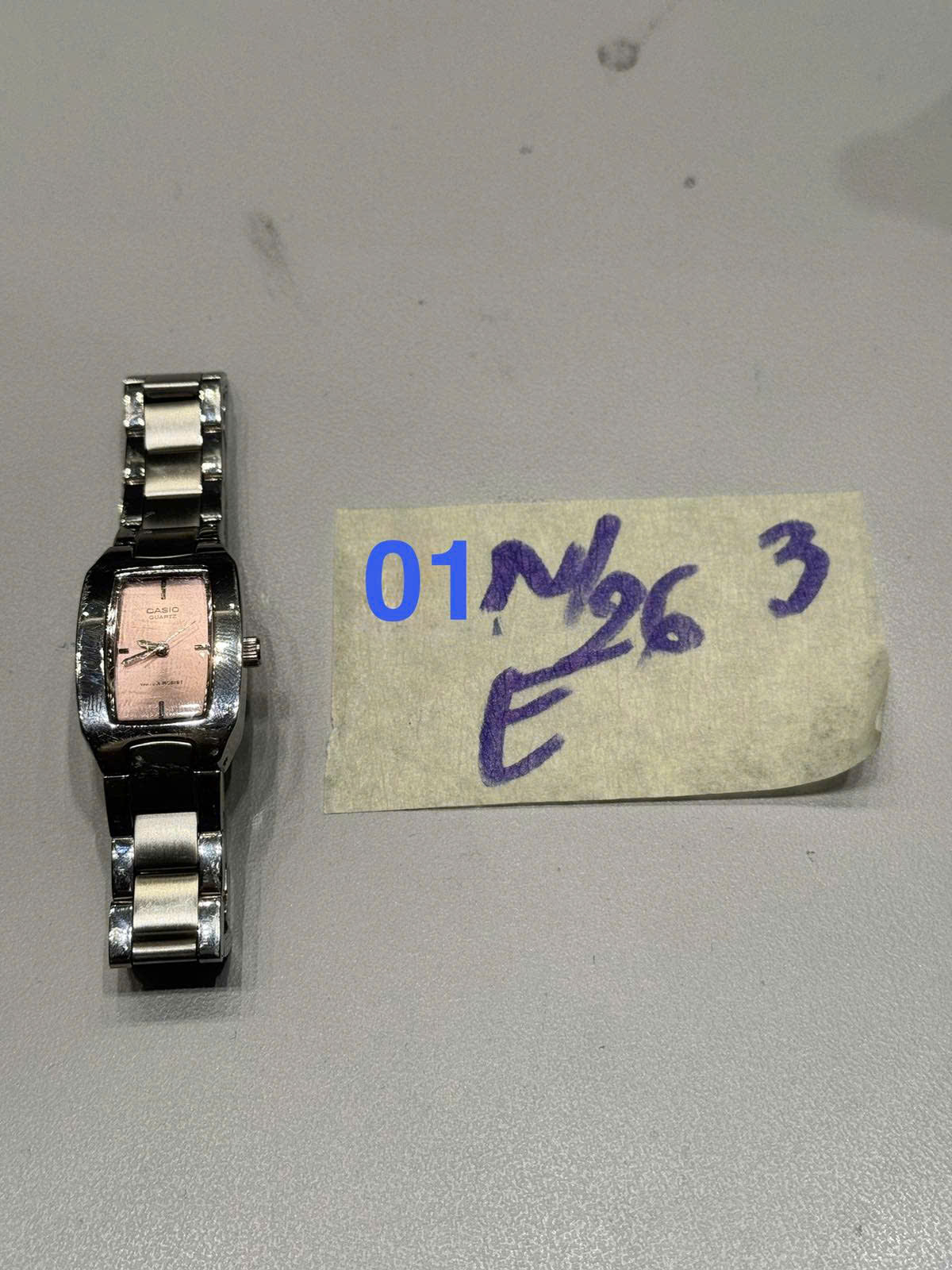 Ngày tiếp nhận: 01/01/2026 Mã hồ sơ: 01N2025E Mô tả: 01 đồng hồ dây kim loại màu bạc mặt hồng có chữ CASIOvà 01 nón xanh kẻ. |