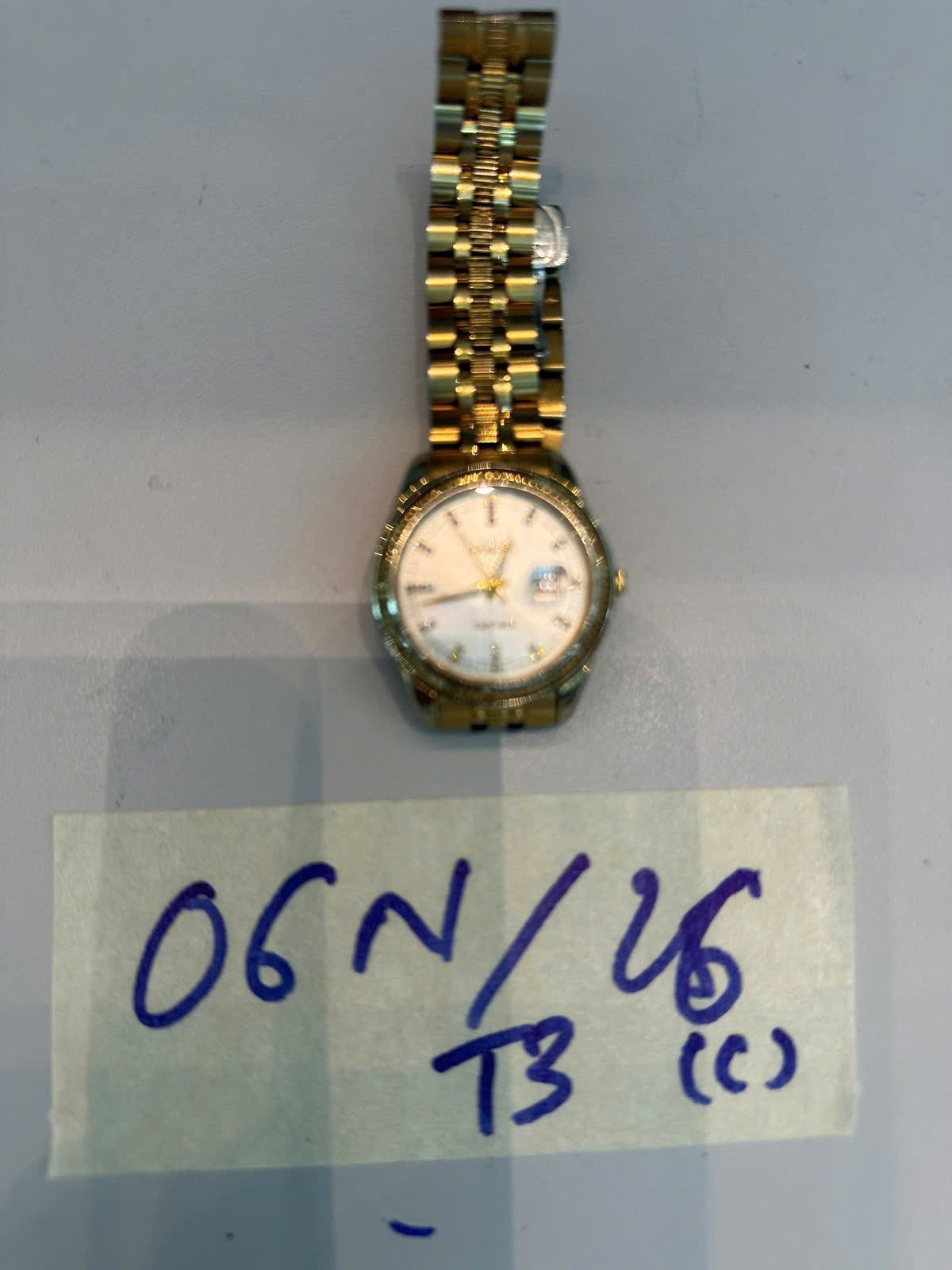 Ngày tiếp nhận: 05/01/2026 Mã hồ sơ: 06N2026C Mô tả: 01 đồng hồ dây kim loại màu vàng, mặt trắng có chữ A Olix đã qua sử dụng. |