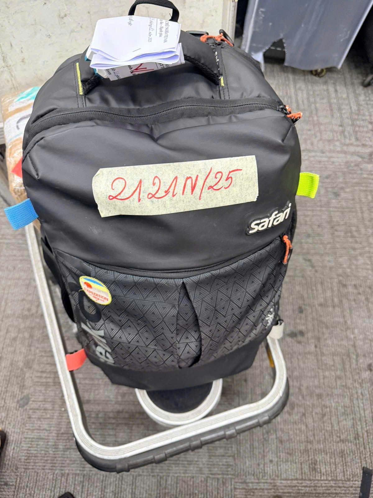 Ngày tiếp nhận: 04/12/2025 Mã hồ sơ: 2121N2025 Mô tả: 01 balo màu đen có chữ "SAFARI" bên trong chứa 2 đôi giày và 2 áo khoác màu đen & trắng. |