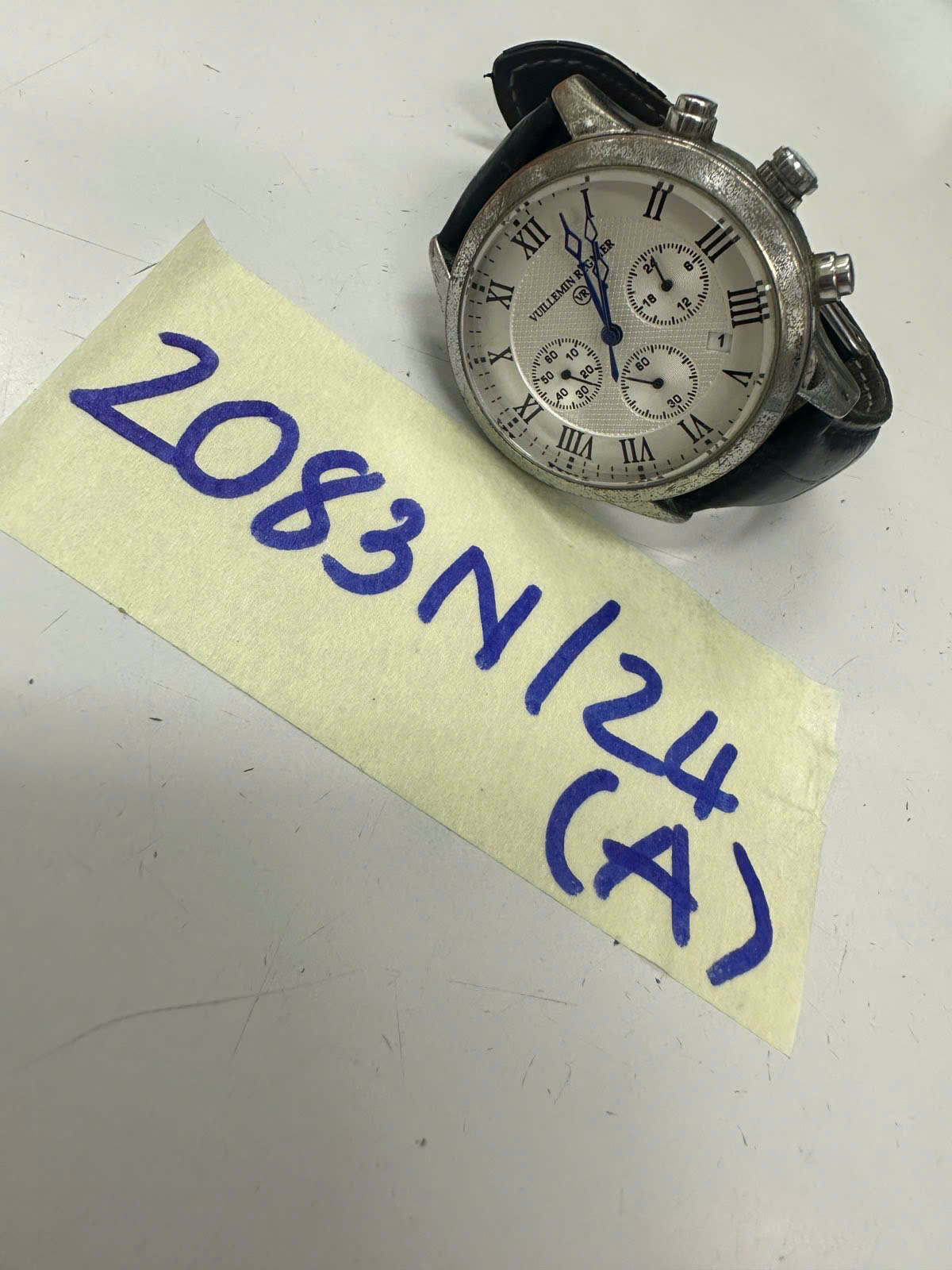 Ngày tiếp nhận: 04/12/2024 Mã hồ sơ: 2083N2024A Mô tả: 01 đồng hồ kim loại mặt tròn, dây da màu đen, chữ VUILLEMIN REGNIER. |